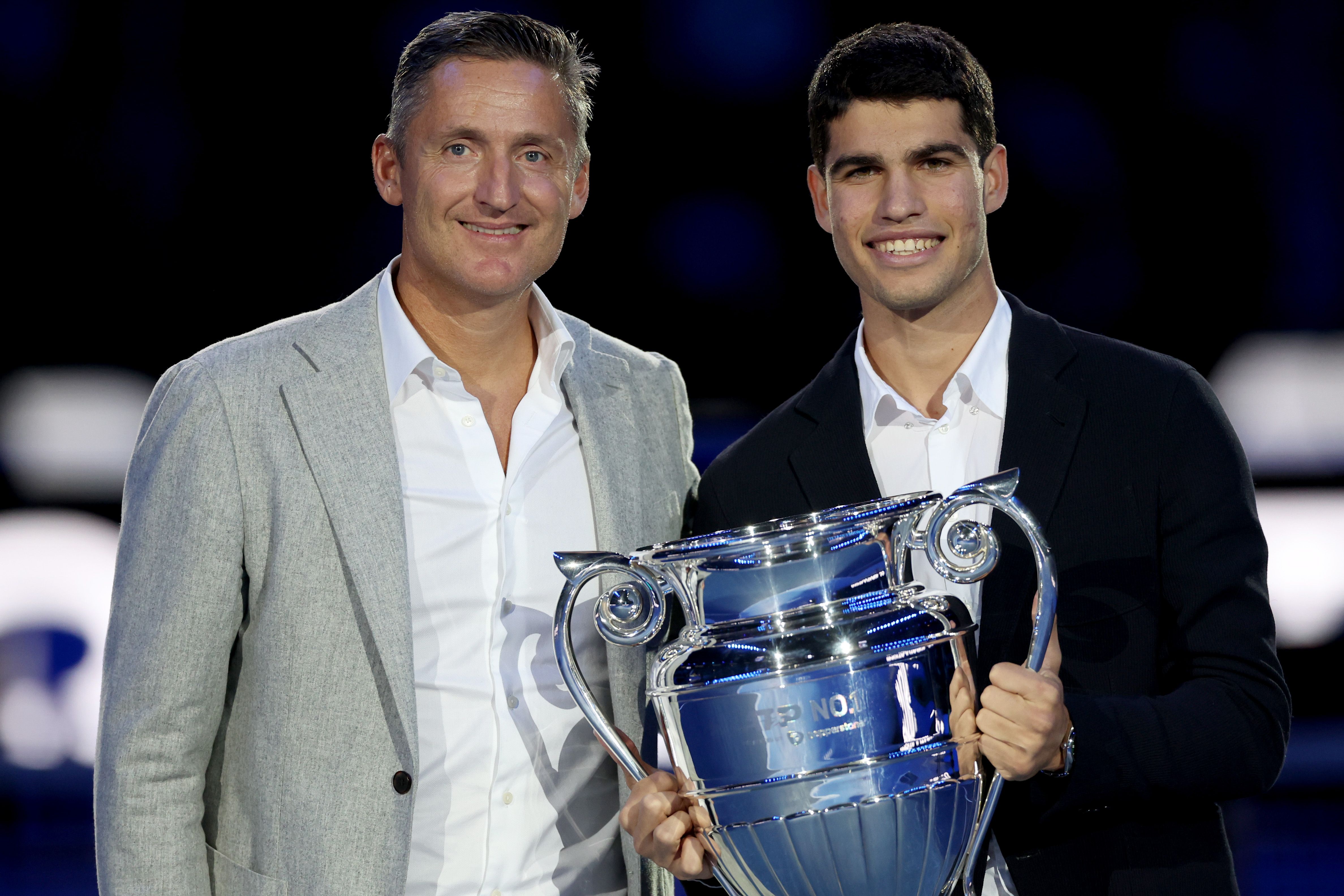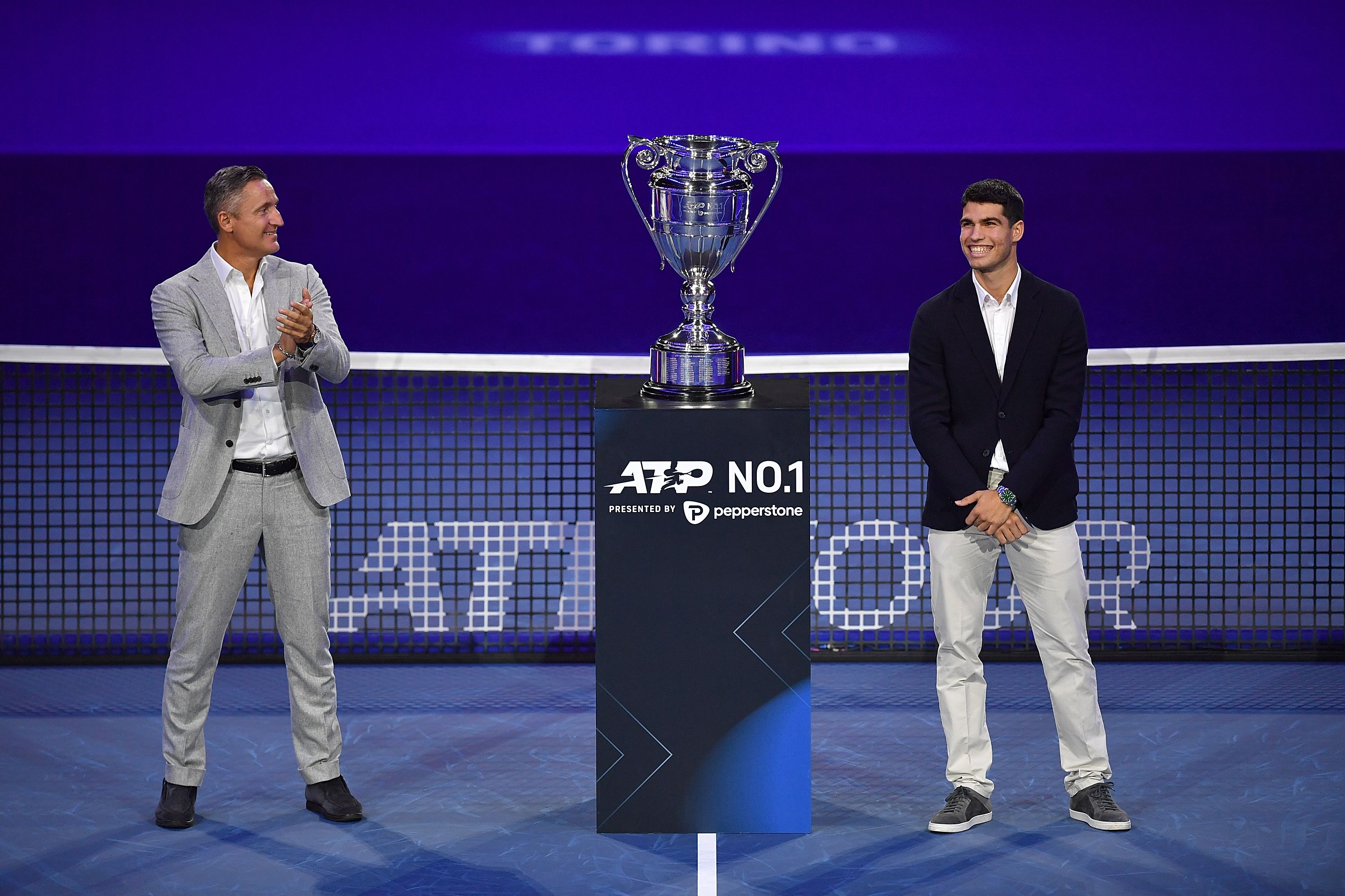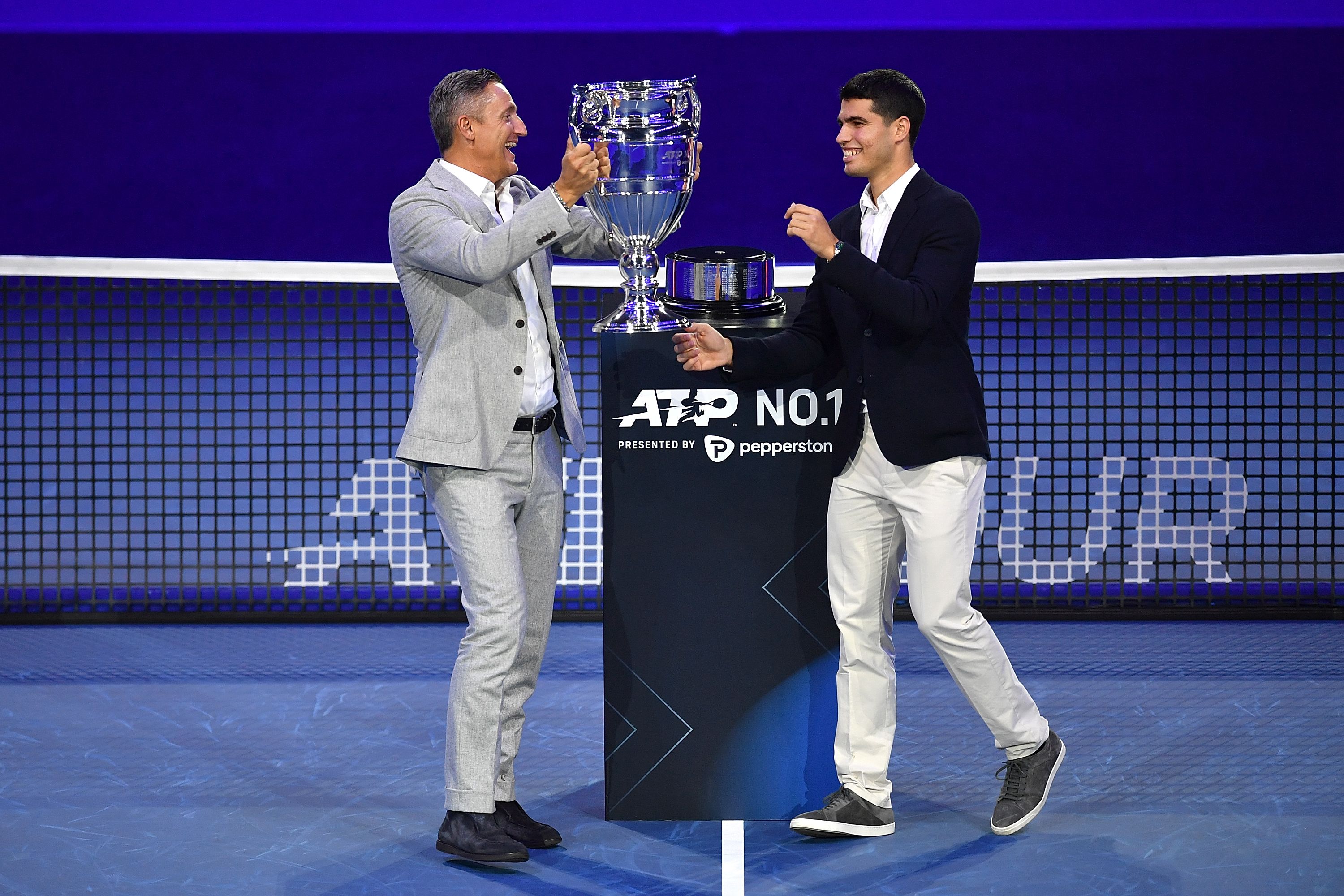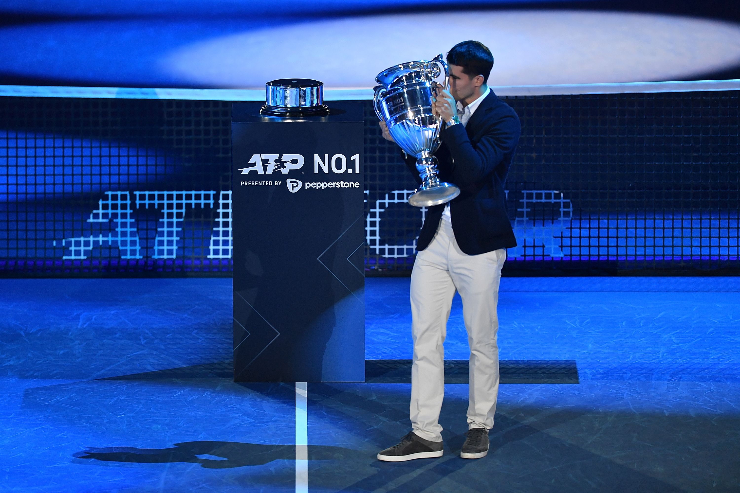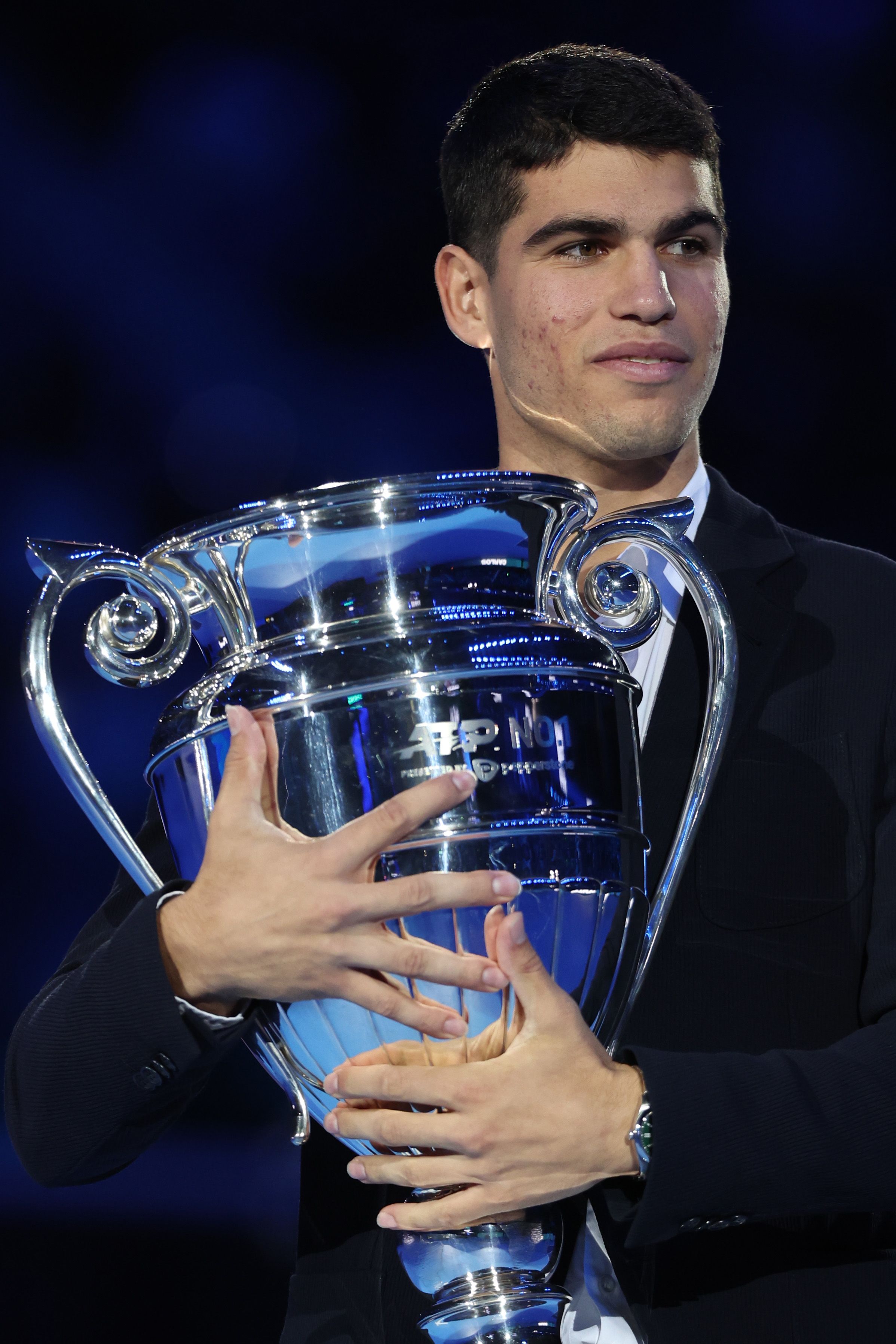Il momento carico di emozione in cui Carlos Alcaraz, 19 anni, riceve da Andrea Gaudenzi, presidente dell'ATP, il premio come n.1 del mondo a fine stagione. E' il più giovane della storia a raggiungere un simile traguardo
