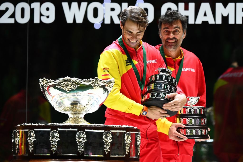 Con Rafael Nadal, Bruguera festeggia la Coppa Davis appena conquistata a Madrid.