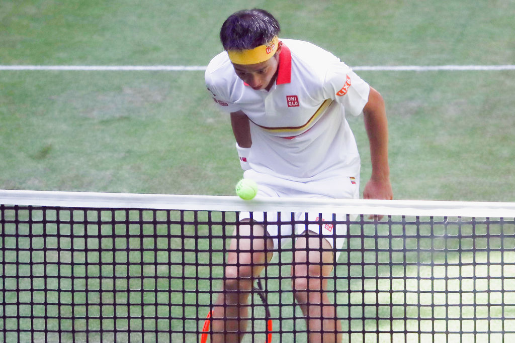 Kei Nishikori sembra voler parlare con la palla che danza sul nastro. Il giapponese può giocare il drop sia di diritto che di rovescio mantenendo una buona efficacia.