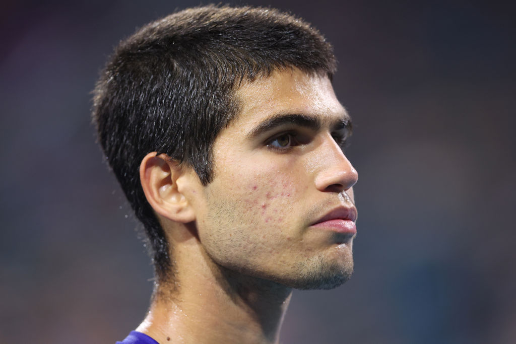 Un intenso primo piano di Carlos Alcaraz. La vittoria in due set su Hurkacz gli è valsa la finale.