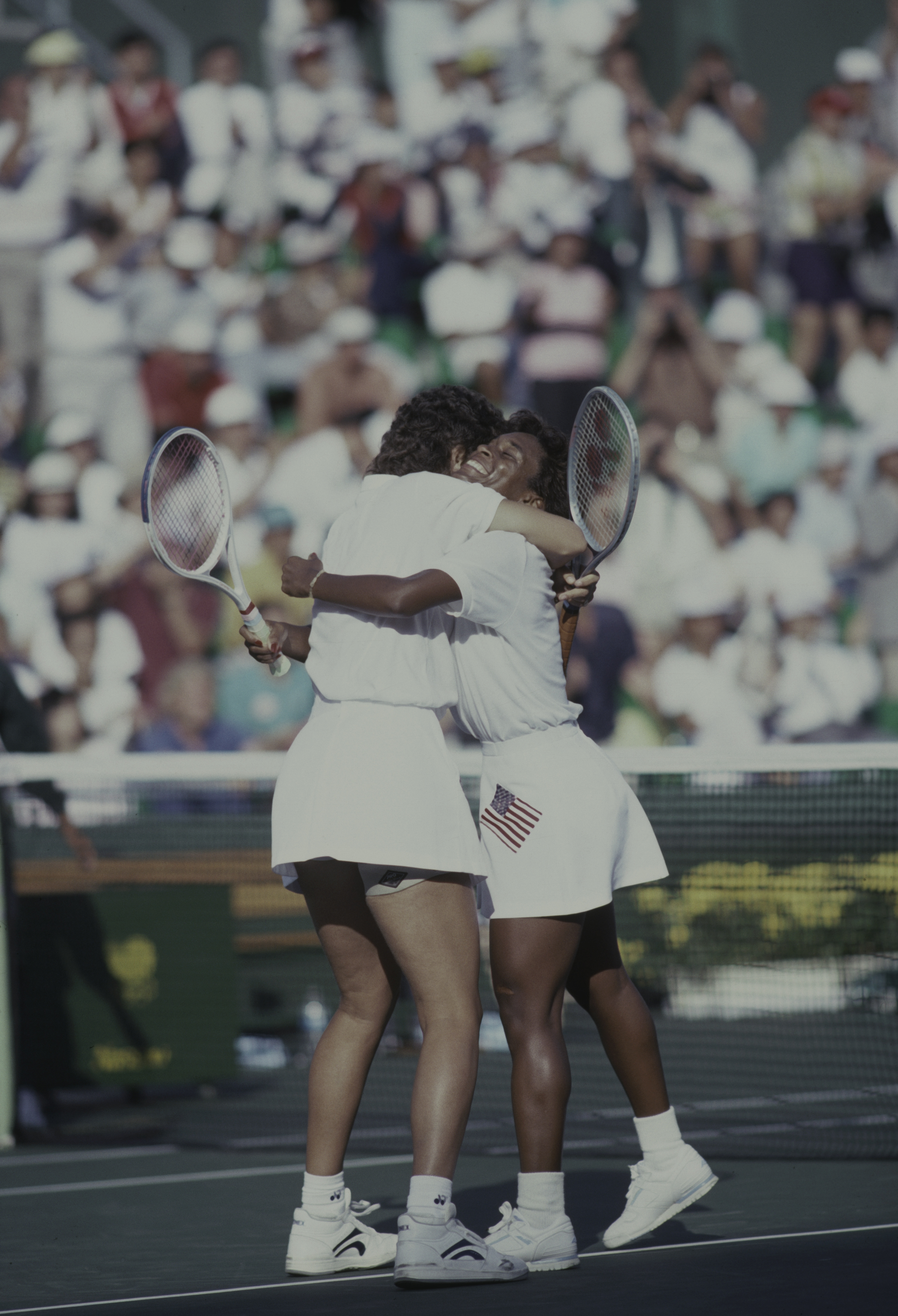 L'abbraccio tra le vincitrici del doppio femminile, Shriver e Garrison, a segno in finale su Novotna e Sukova.