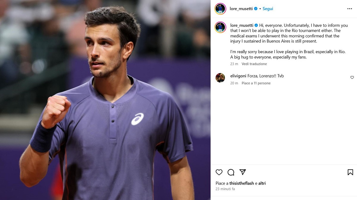 “Ciao a tutti. Purtroppo devo informarvi che non potrò partecipare al torneo di Rio. Gli esami medici a cui mi sono sottoposto questa mattina hanno confermato che l'infortunio subito a Buenos Aires è ancora presente. Mi dispiace molto perché amo giocare in Brasile, soprattutto a Rio. Un abbraccio a tutti, soprattutto ai miei tifosi”, il messaggio postato da Musetti sul suo account Instagram.