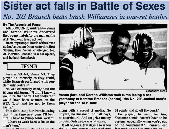 Nel gennaio del 1998 a Melbourne, Serena e Venus Williams ebbero l'idea di lanciare la sfida a un giocatore intorno al numero 200 Atp. Raccolse l'invito Karsten Braasch, tedesco di 30 anni con il vizio del fumo e un tennis atipico. Fu una battaglia dei sessi che in seguito le sorelle hanno cercato di dimenticare