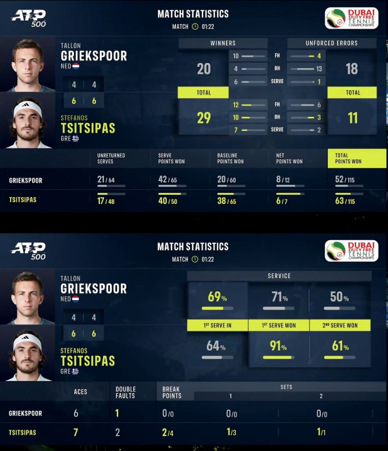 What a performance ??@steftsitsipas takes out Griekspoor in a flawless 6-4 6-4 to make his 3rd Dubai final!#DDFTennis pic.twitter.com/tkg80Z9y9Q