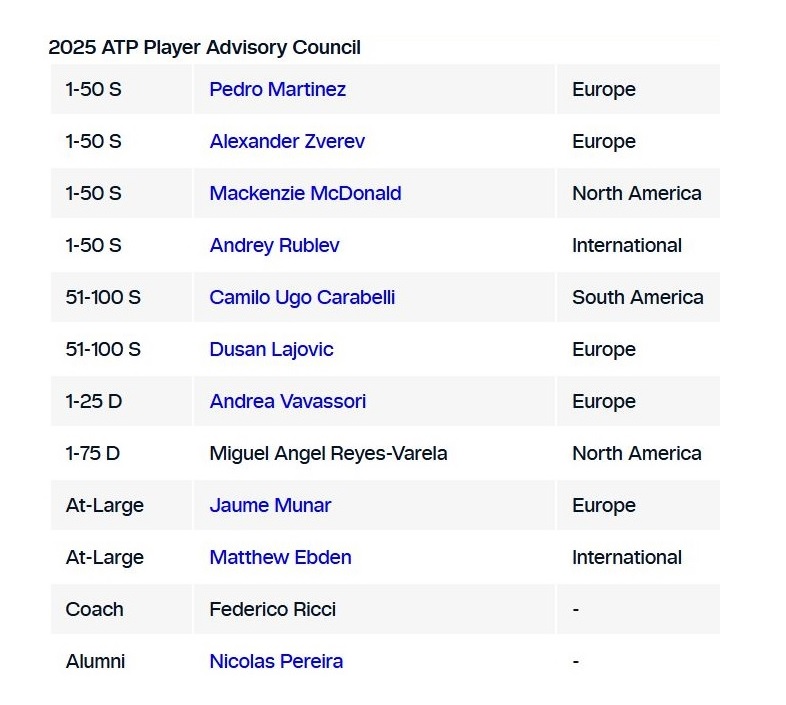 L'ATP ha reso nota oggi la composizione del Consiglio consultivo dei giocatori (Player Advisory Council) per la stagione 2025. Lo spagnolo Pedro Martinez, il russo Andrey Rublev, l'argentino Camilo Ugo Carabelli, l'altro spagnolo Jaume Munar e l'azzurro Andrea Vavassori sono i nuovi membri del Consiglio, il cui mandato ha la durata di due anni (2025-2026). I cinque nuovi membri si aggiungono al tedesco Alexander Zverev, allo statunitense Mackenzie McDonald, al serbo Dusan Lajovic, al messicano Miguel Angel Reyes-Varela e all'australiano Matthew Ebden.