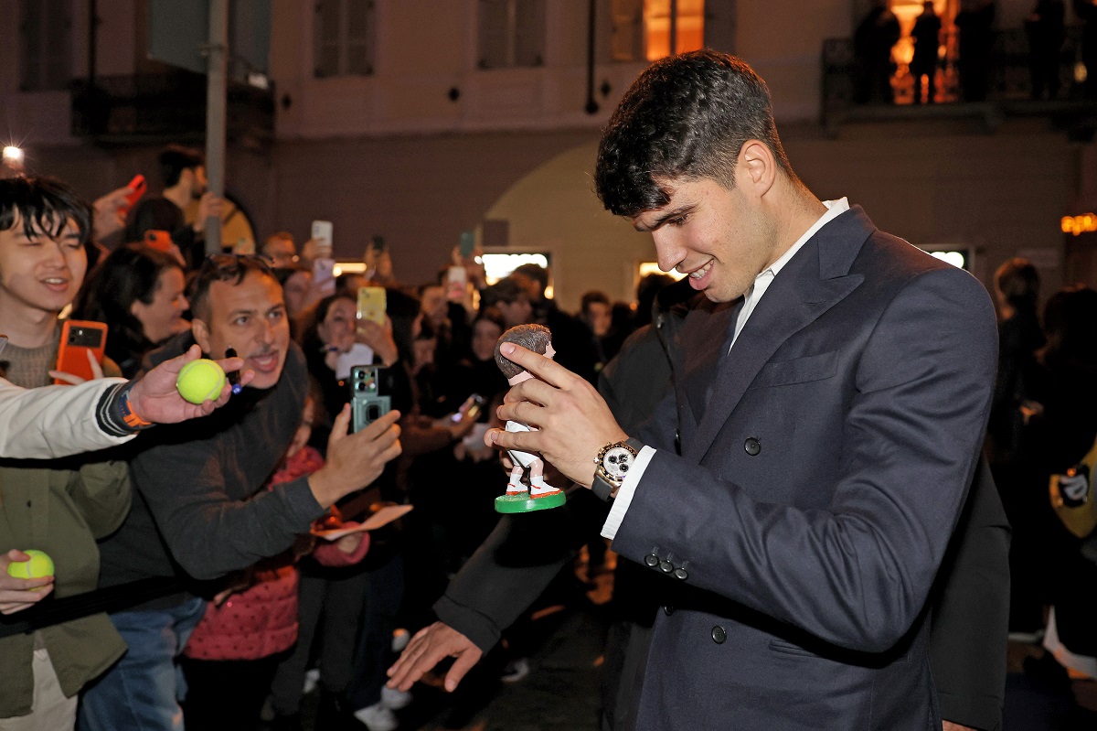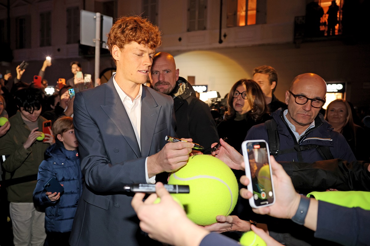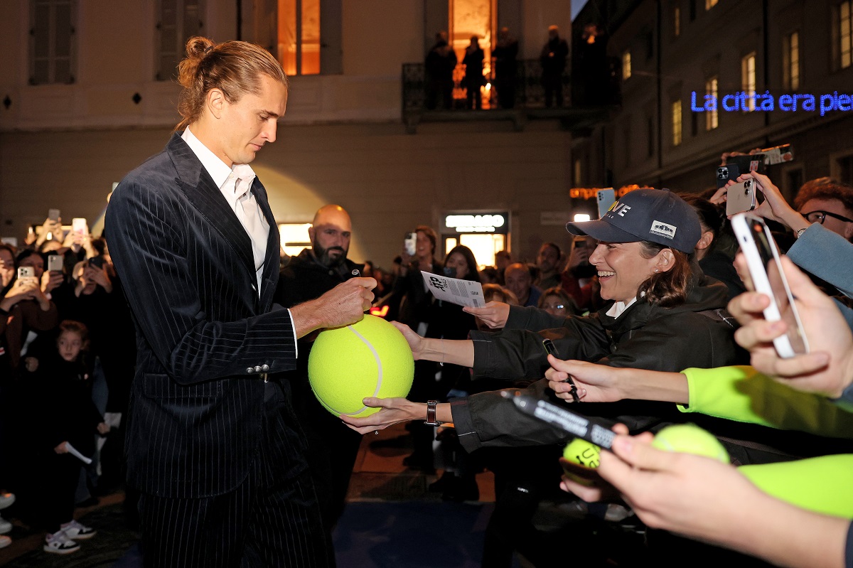 Scenografico l'ingresso in teatro: all'arrivo delle star del tennis si abbasano le luci in sala e restano illuminati solo i palchi. Parte la musica e uno dopo l'altro fanno il loro ingresso, in ordine di classifica inverso, accolti sul palco da Cattelan ("Questo è un evento che ha rapito la città"), dal Presidente della FITP Angelo Binaghi e dal quello dell'ATP Andrea Gaudenzi, ecco Andrey Rublev, Alex De Minaur, Casper Ruud, Taylor Fritz, Daniil Medvedev, Carlos Alcaraz, Alexander Zverev e Jannik Sinner. Mani sfiorate ai fan - soprattutto i più piccoli, pazzi di gioia nel vedere da vicino i loro idoli - nel salire sul palco, con l'applausometro che s'impenna decisamente a partire da "Carlitos" per toccare il top con il re del tennis mondiale, Jannik Sinner da Sesto Pusteria.