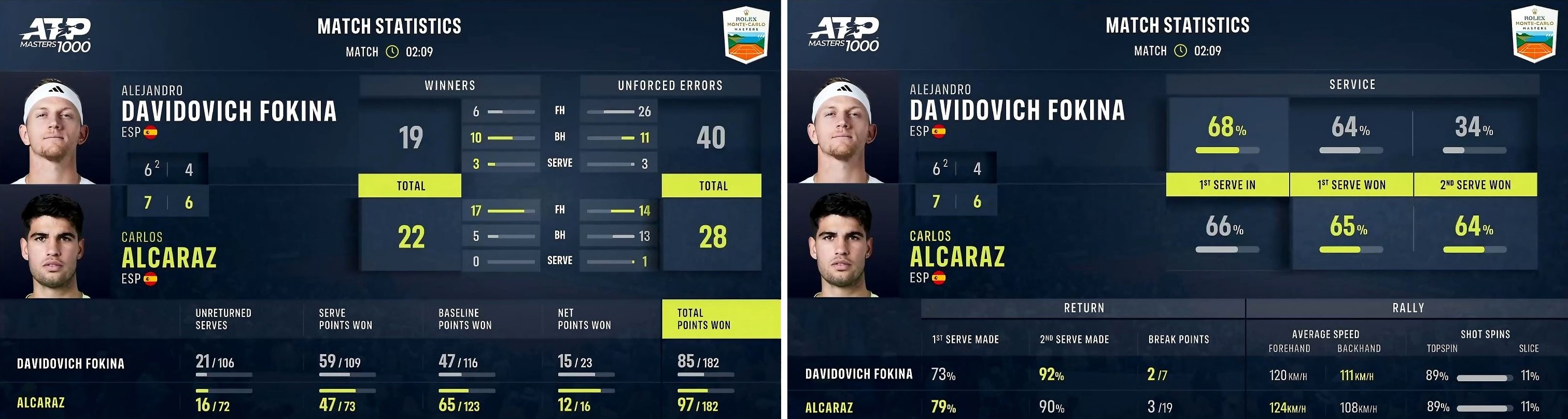 In semifinale il 21enne di El Palmar (Murcia), n.3 del ranking e secondo favorito del seeding, si è aggiudicato per 76(2) 64, in due ore e nove minuti di partita, il derby con il connazionale Alejandro Davidovich Fokina, n.42 ATP (ma arrivato fino al n.21 ad agosto 2023), generoso e coraggioso ma con la tendenza ogni tanto ad andare fuori giri. La vittoria numero 19 di questo 2025 (a fronte di 4 sconfitte) permette ad Alcaraz di raggiungere la sua 23esima finale in carriera (settima in un "1000"), la seconda stagionale dopo quella raggiunta a Rotterdam, dove poi ha messo in bacheca il suo 17esimo trofeo.