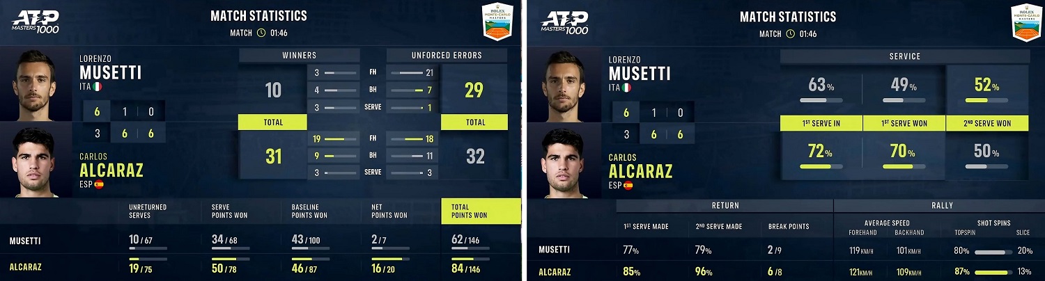Senza lasciarsi distrarre Carlos vola verso il suo primo successo a Monte-Carlo, con Lorenzo che prova ad opporsi solo con il braccio: con un diritto a campo oramai vuoto Alcaraz archivia la pratica. E’ lui il nuovo principe di Monte-Carlo. GAME, SET, MATCH!