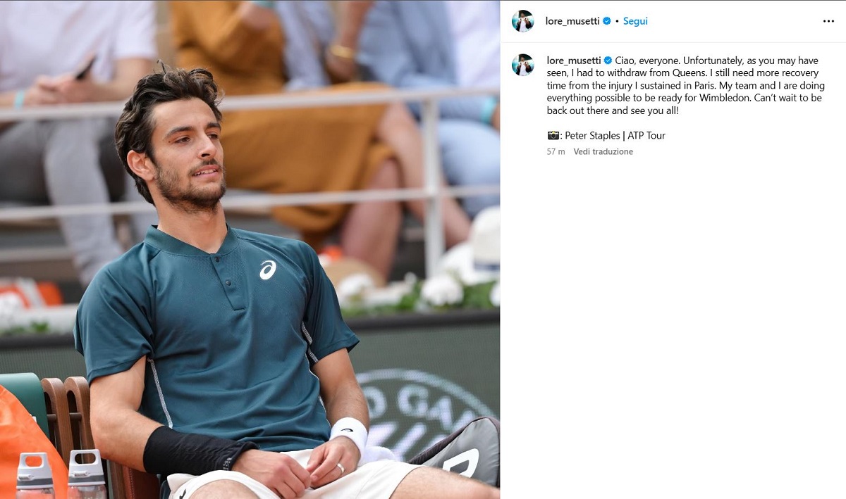 Con queste premesse era in forte dubbio la partecipazione del neo n.6 del ranking ("best") all'ATP 500 del Queen's in programma la prossima settimana dove deve difendere i punti della finale raggiunta lo scorso anno (stoppato dallo statunitense Tommy Paul). Musetti ha disputato una straordinaria stagione sul "rosso" raggiungendo la finale a Monte-Carlo e le "semi" a Madrid, Roma e da ultimo al Roland Garros. Per Lorenzo però si avvicinano due "cambiali in scadenza" sui prati piuttosto pesanti: oltre la già citata finale al Queen's, infatti, il tennista toscano, che lo scorso anno era stato il tennista più vincente sui prati - aveva raggiunto anche la semifinale a Wimbledon (fermato da Djokovic).