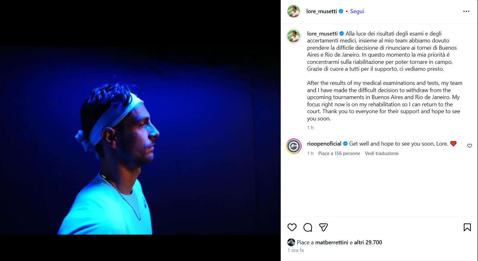 "Alla luce dei risultati degli esami e degli accertamenti medici, insieme al mio team abbiamo dovuto prendere la difficile decisione di rinunciare ai tornei di Buenos Aires e Rio de Janeiro. In questo momento la mia priorità é concentrarmi sulla riabilitazione per poter tornare in campo. Grazie di cuore a tutti per il supporto, ci vediamo presto", ha postato il 23enne di Carrara sul suo profilo Instagram.