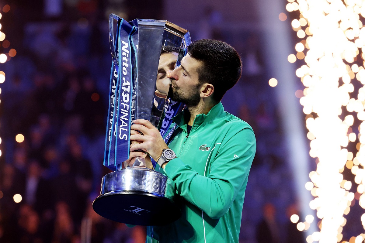 Novak Djokovic bacia il trofeo delle Nitto ATP Finals 2023 al Pala Alpitour di Torino (Foto Sposito/FITP)