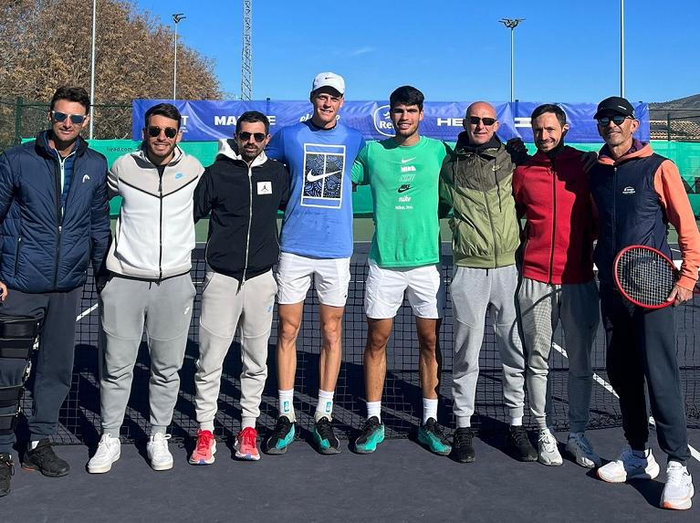 Jannik Sinner e Carlos Alcaraz con i rispettivi team all'Academy di Ferrero a Villena (foto Twitter Jannik Sinner)