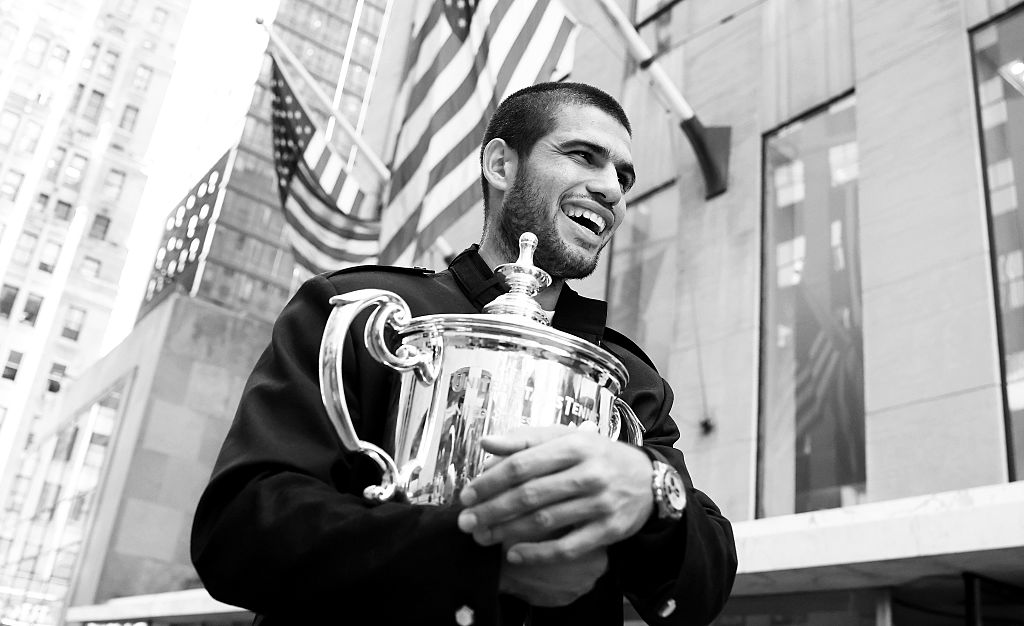 Carlos Alcaraz, l’atleta mediterraneo che gioca con la canottiera, a spalle nude, con i muscoli che guizzano e le date delle vittorie più significative tatuate sul corpo insieme a quelle “tre C” che si fece scrivere per prime sulla pelle, il motto di suo nonno: Cabeza, Corazon e Cojones. Un mantra che in campo si traduce in un tennis istintivo e combattente, pieno di creatività, di giocate devastanti o morbidissime spesso improvvisate lì per lì a sostenere una forza indomabile.