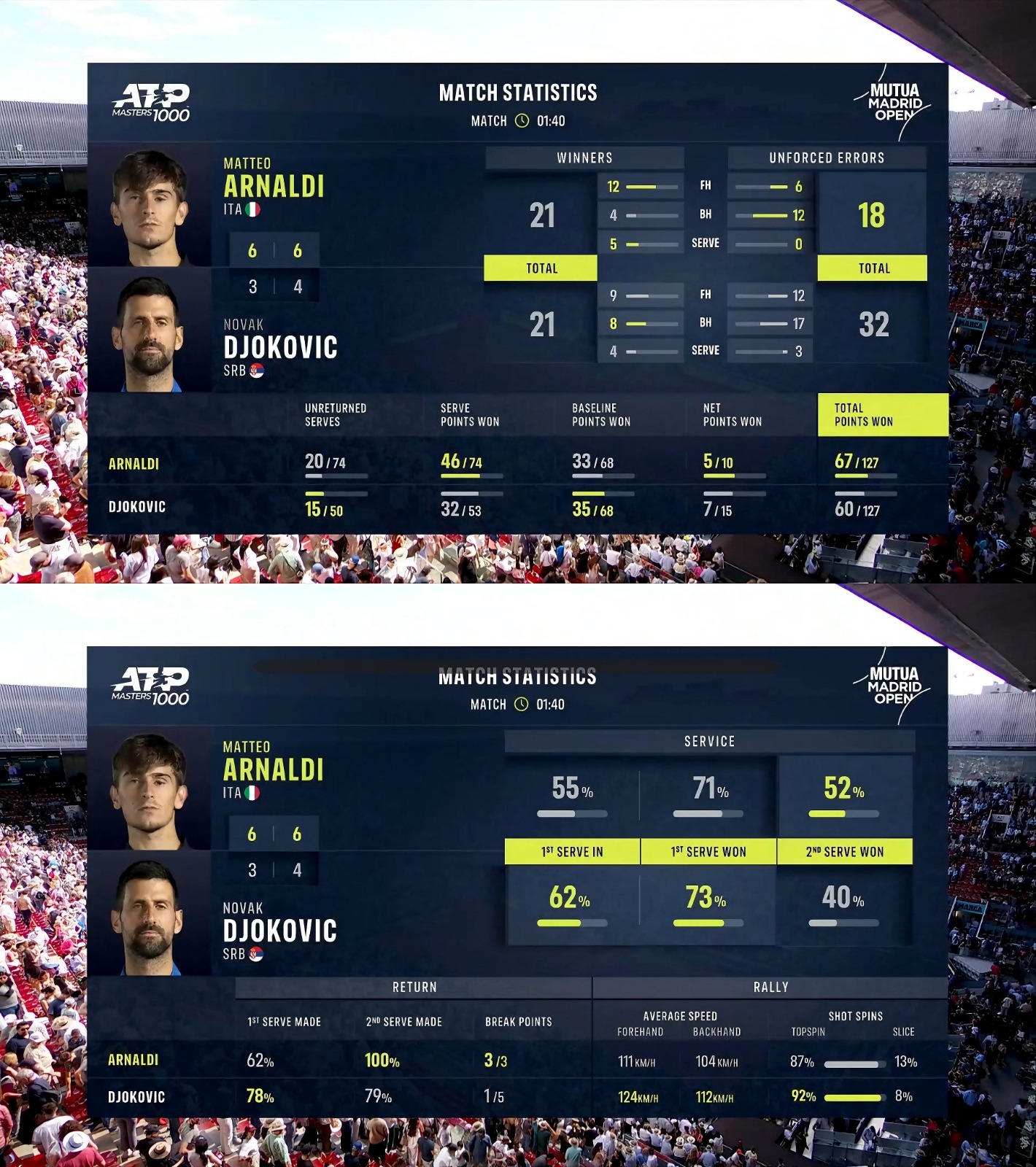 Al netto della sua umanità, permangono i dubbi sullo stato di forma del serbo, che ha rimediato la quarta sconfitta in un match d'esordio nel 2025 dopo quelle di Doha, Indian Wells e Monte-Carlo. Considerando quella nel Principato e quella odierna, è soltanto la seconda volta, nella sua lunga carriera, che rimedia due sconfitte consecutive al primo match: la prima volta era successo nel 2018, tra Indian Wells e Miami. Troppo poco per impensierire Arnaldi il 40% dei punti vinti sulla seconda, così come troppi risultano i 32 gratuiti. L'impressione è che a salire debba essere anche la sua forma fisica, dato anche il gran numero di volte in cui è sembrato arrivate in ritardo - o comunque scomposto - sulla palla.