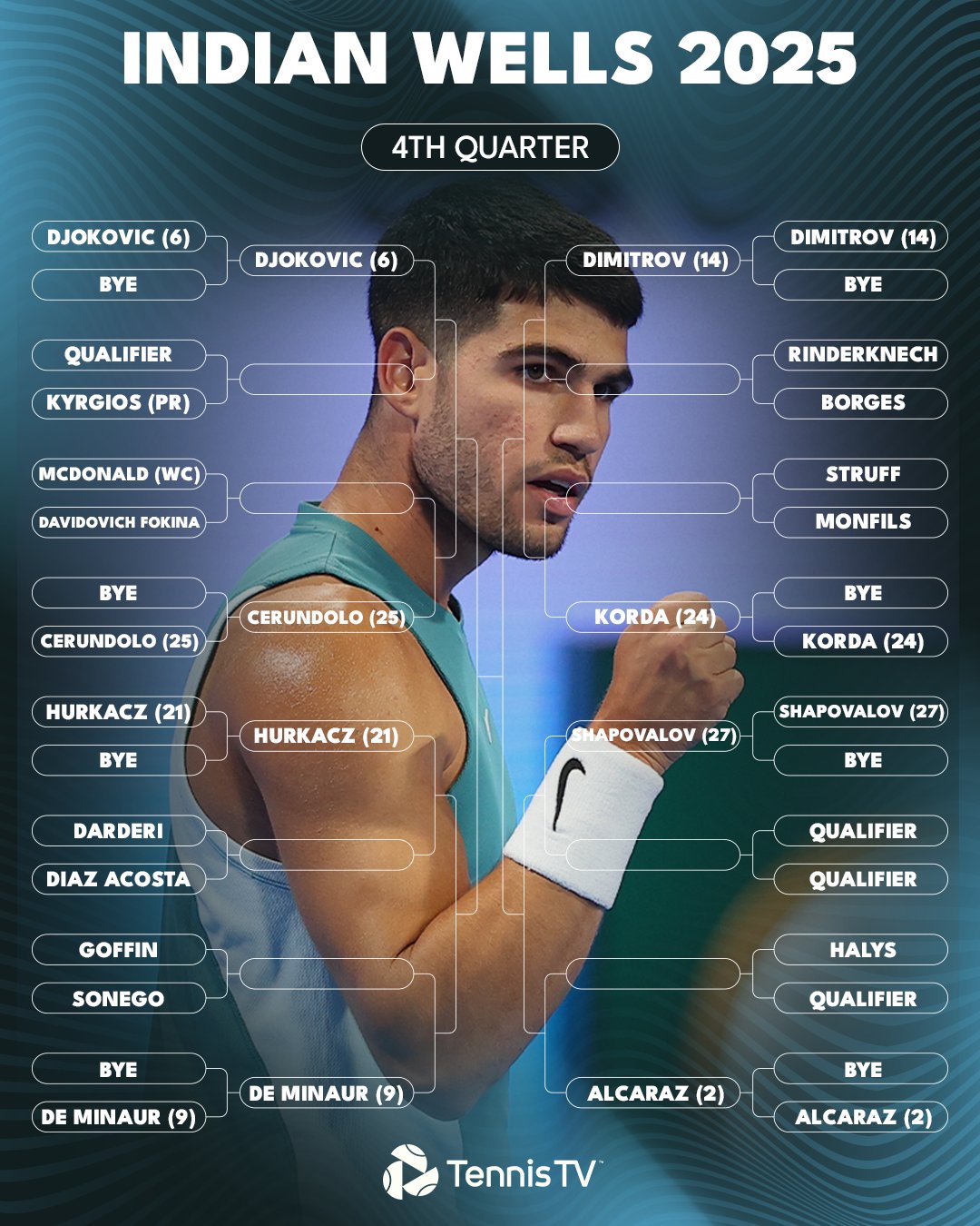 Ed eccoci al quarto e ultimo quarto di tabellone, quello sulla carta più conteso vista la coabitazione tra il due volte vincitore del torneo Carlos Alcaraz e il cinque volte campione Novak Djokovic. I due potrebbero sfidarsi ai quarti. Entrambi non sono però attesi da esordi semplici: il murciano sfiderà con molta probabilità il francese Quentin Halys, recente semifinalista a Dubai, mentre per il serbo potrebbe profilarsi una sfida contro l'amico Nick Kyrgios, assente da Indian Wells dal 2022 e in competizione anch'egli in virtù del ranking protetto. Detto degli incroci tricolori che potrebbero presentarsi sul percorso di Alex De Minaur (n.9) e Hubert Hurkacz (n.21) - per loro rispettivamente un potenziale secondo turno contro Lorenzo Sonego e Luciano Darderi -, Denis Shapovalov, vincitore di due titoli da novembre a oggi (Belgrado e Dallas) esordirà contro un qualificato, più complesso invece il debutto di Grigor Dimitrov (n.14) e Sebastian Korda (n.24) che si giocheranno l'accesso al terzo turno contro un ventaglio di rivali che annovera i francesi Rinderknech e Monfils nonché il portoghese Nuno Borges, che a Melbourne strappoò un set a Carlos Alcaraz e a Dubai riuscì a eliminare al primo turno il francese Arthur Fils.