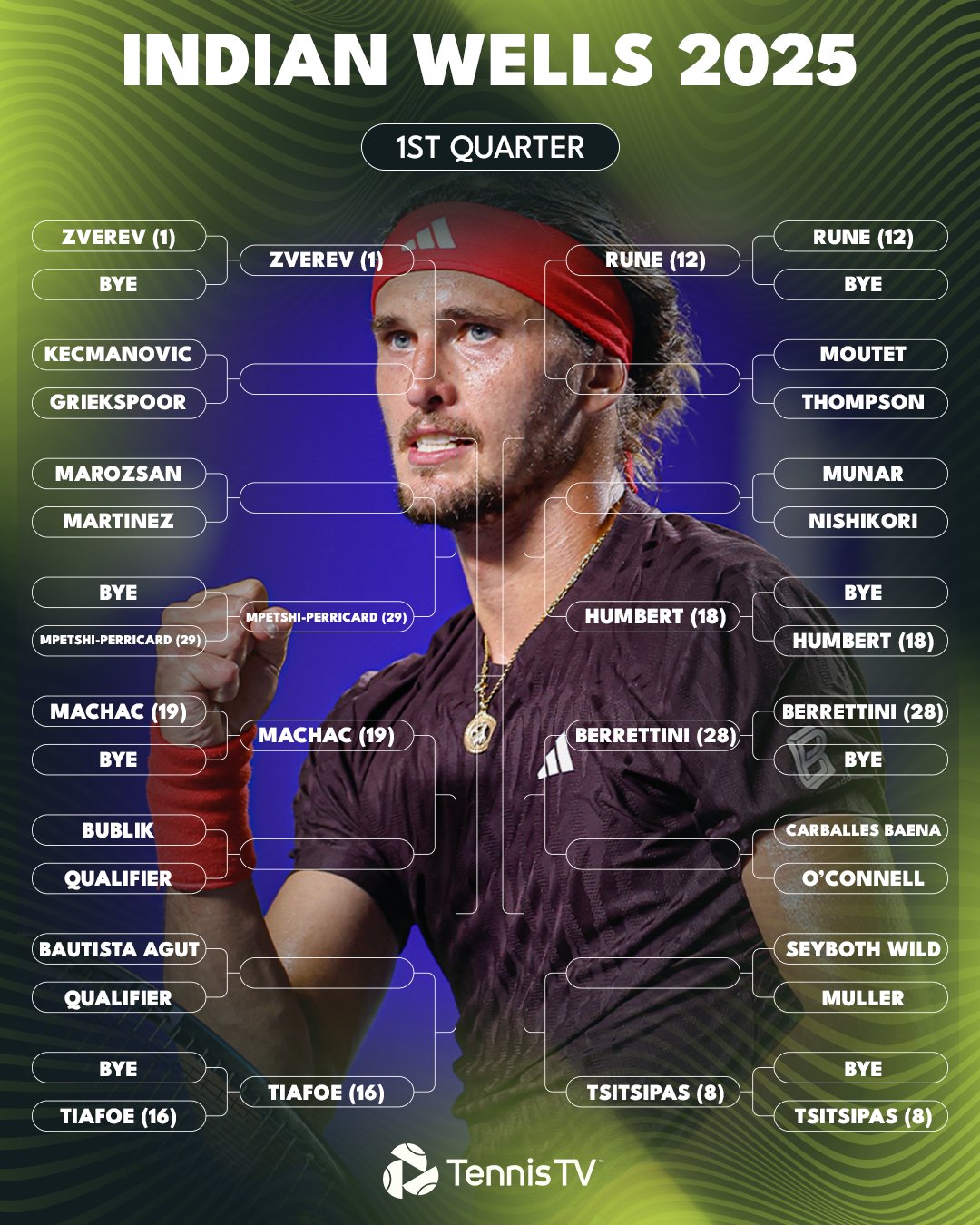 E' Alexander Zverev la testa di serie numero uno del main draw del BNP Paribas Open di Indian Wells, primo Masters1000 della stagione sul circuito Atp. il tedesco, n.2 del mondo, debutterà al secondo turno in virtù di un bye contro uno tra il serbo Miomir Kecmanovic o l'olandese Tallon Griekspoor, recente semifinalista di Dubai. Tomas Machac (n.20) testa di serie n.18 nonché vincitore la scorsa settimana ad Acapulco, attende invece il kazako Alexander Bublik atteso all'esordio da un qualificato. La testa di serie n.8 Stefanos Tsitsipas, vincitore lo scorso a weekend ma mai capace di spingersi oltre ai quarti di finale nel deserto californiano, se la vedrà invece contro uno tra il francese Alexandre Muller o il brasiliano Thiago Seyboth Wild. Scivoloso l'esordio che attende invece Holger Rune, n.12 del seeding, che sfiderà il vincitore del match tra il francese Correntin Mouret e l'australiano Jordan Thompson.