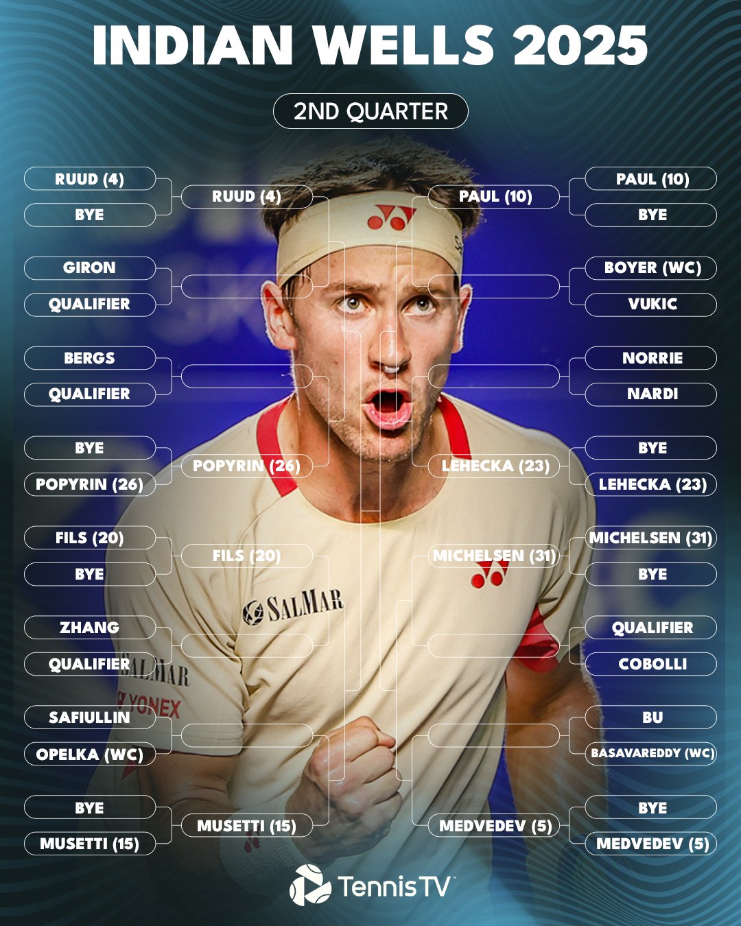 Il secondo quarto del tabellone vede invece presenti sia il n.4 che il n.5 del seeding. Casper Ruud aprirà i giochi contro uno l'americano Marcus Giron o un qualificato mentre Daniil Medvedev, due volte finalista a Indian Wells (sconfitto in entrambe le occasioni da Carlos Alcaraz), attende uno tra la wild card Basavareddy e il cinese Bu. Terza testa di serie più alta è l'americano Tommy Paul (n.10) che potrebbe debuttare al secondo turno con un derbu contro il connazionale n.115 del ranking Tristan Boyer che al primo turno affronterà Aleksander Vukic.