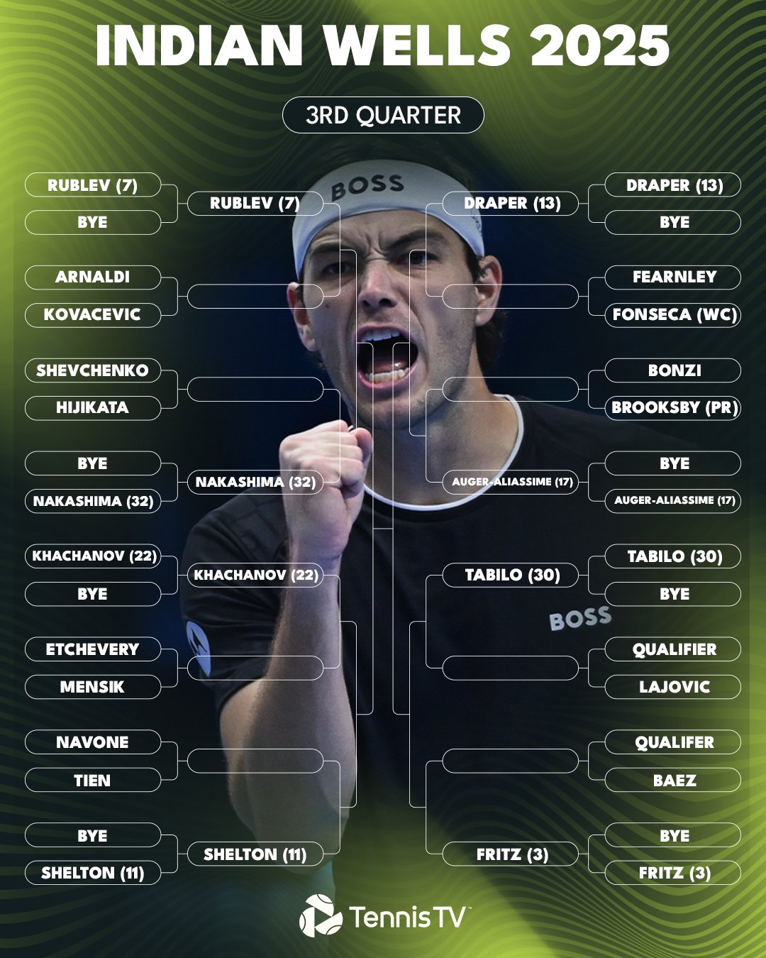 Taylor Fritz (n.3), campione a Indian Wells nel 2022, al secondo turno potrebbe affrontare uno dei giocatori più in forma del momento, l'argentino Sebastian Baez, finalista nelle ultime due settimane a Rio de Janeiro, evento da lui concluso vittoriosamente, e a Santiago, dove è stato sconfitto nell'ultimo atto dal serbo Laslo Djere. Joao Fonseca, uno dei nomi più attesi in California, esordirà contro il britannico Jacob Fearnley, da lui sconfitto lo scorso dicembre nel Challenger di Canberra. In caso di vittoria per lui al secondo turno ci sarà un'altra sfida contro un giocatore britannico, il n.13 del seeding Jack Draper. Ben Shelton (n.11) al secondo turno potrebbe invece misurare le aspettative di Learner Tien (n.64), finalista delle ultime Atp NextGen Finals, eliminato agli ottavi degli Australian Open da Lorenzo Sonego e quarto finalista ad Acapulco, una serie di risultati che nel giro di tre mesi lo hanno visto issarsi dalla posizione n.122 alla top70. Secondo turno agevole all'orizzonte anche per Felix Auger-Aliassime, leader del ranking per numero di vittorie in stagione (15) e titoli vinti (2), che sfiderà uno tra il francese Bonzi o l'americano Jenson Brooksby, in California grazie al ranking protetto.