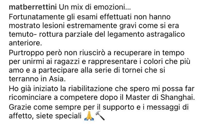 "Purtroppo però non riuscirò a recuperare in tempo per unirmi ai ragazzi e rappresentare i colori che più amo e a partecipare alla serie di tornei che si terranno in Asia. Ho già iniziato la riabilitazione che spero mi possa far ricominciare a competere dopo il Master di Shanghai. Grazie come sempre per il supporto e i messaggi di affetto, siete speciali"