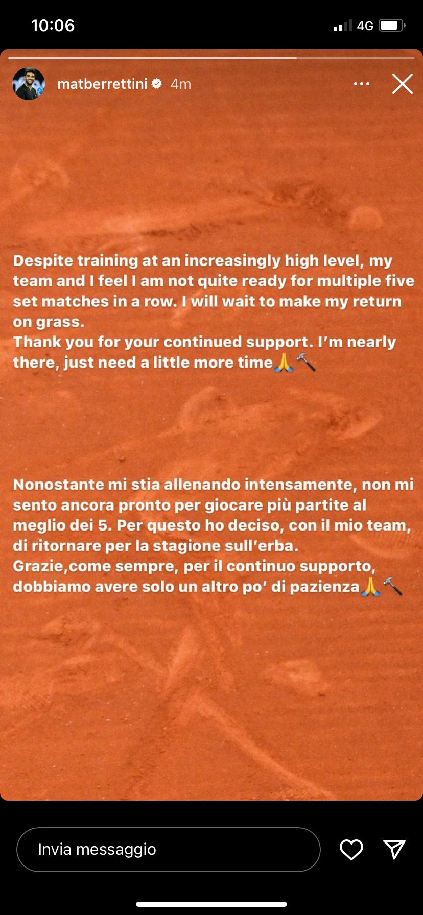 Matteo Berrettini non giocherà il Roland Garros. A dare l'annuncio è stato lo stesso giocatore attraverso una storia Instagram in cui si legge che "nonostante mi stia allenando intensamente, non mi senta ancora pronto per giocare più partite al meglio dei cinque".