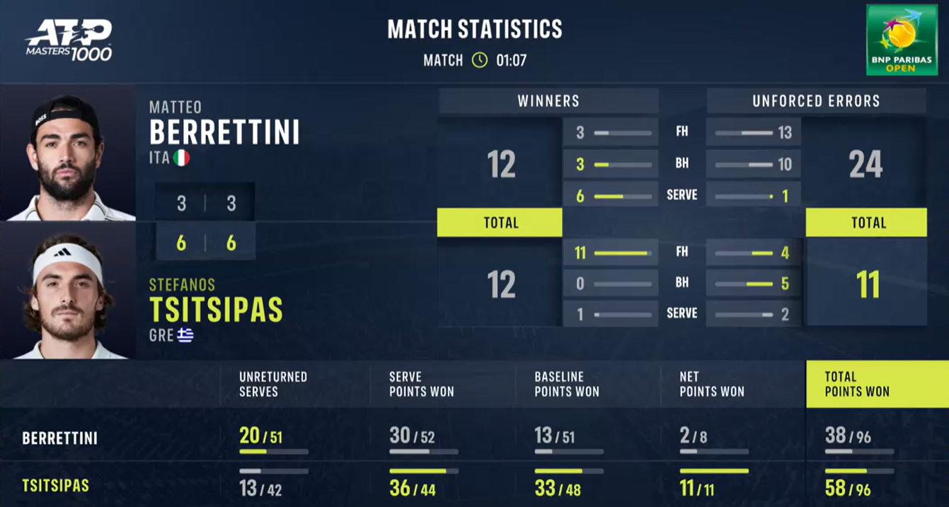 Berrettini si arrende per la quinta volta in sei precedenti al greco, che nel deserto californiano eguaglia così l'ottavo di finale raggiunto un anno fa: ora attende Rune