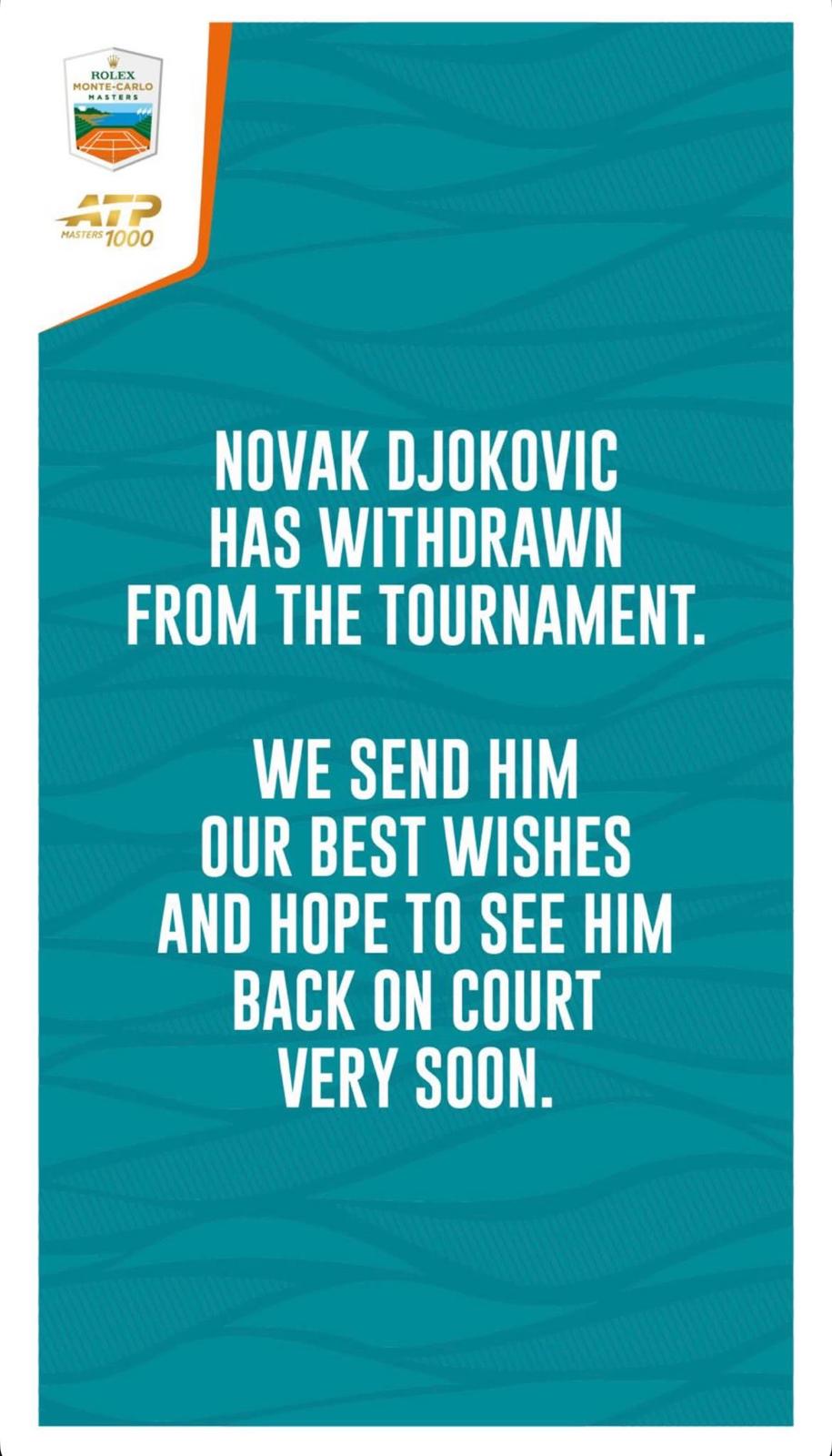 "Novak Djokovic ha dato il suo forfait dal torneo. Gli auguriamo il meglio e speriamo di rivederlo presto in campo". Così, nel pomeriggio, la pagina Instagram ufficiale del Rolex Monte-Carlo Masters, terzo "1000" della stagione (in partenza dal prossimo 5 aprile), ha comunicato il forfait del n.4 al mondo, campione nel Principato nel 2013 e nel 2015.