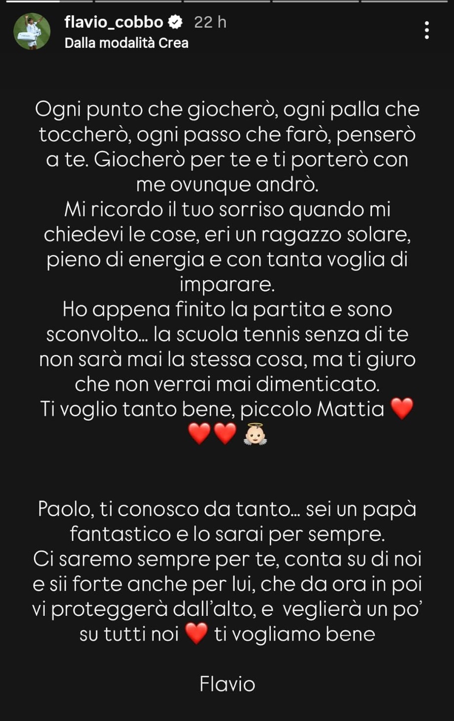 Cobolli aveva scritto per il giovane Mattia un intenso messaggio nelle sue storie Instagram, che potete leggere integralmente qui.