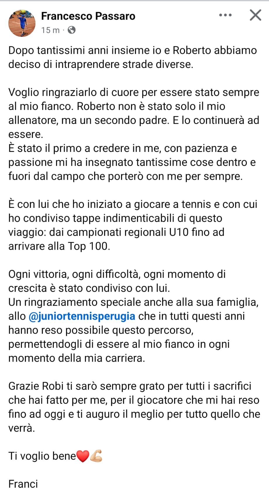 Il messaggio di Francesco Passaro che annuncia la separazione dal suo storico allenatore, Roberto Tarpani
