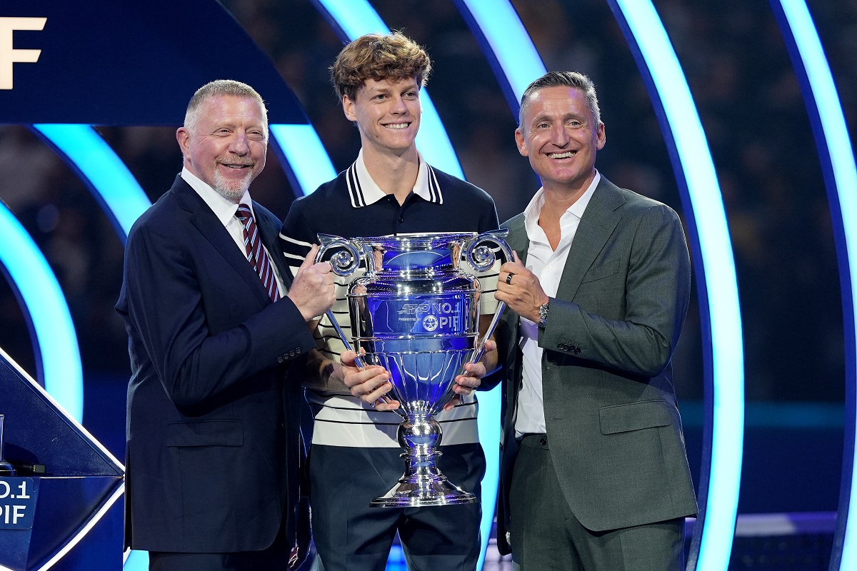 Jannik Sinner premiato come numero 1 ATP. A sinistra Boris Becker, a destra il presidente dell'ATP Andrea Gaudenzi (Foto Sposito/FITP)
