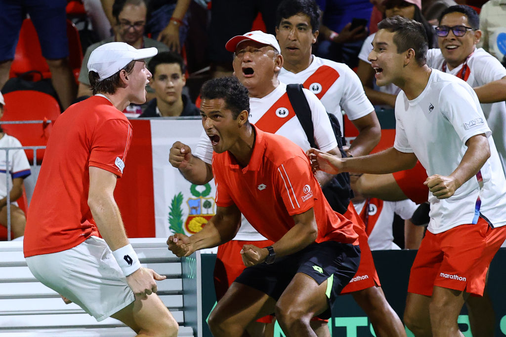 L'esultanza di Ignacio Buse per la vittoria contro Nicolas Jarry in Coppa Davis nel 2024 (Getty Images)