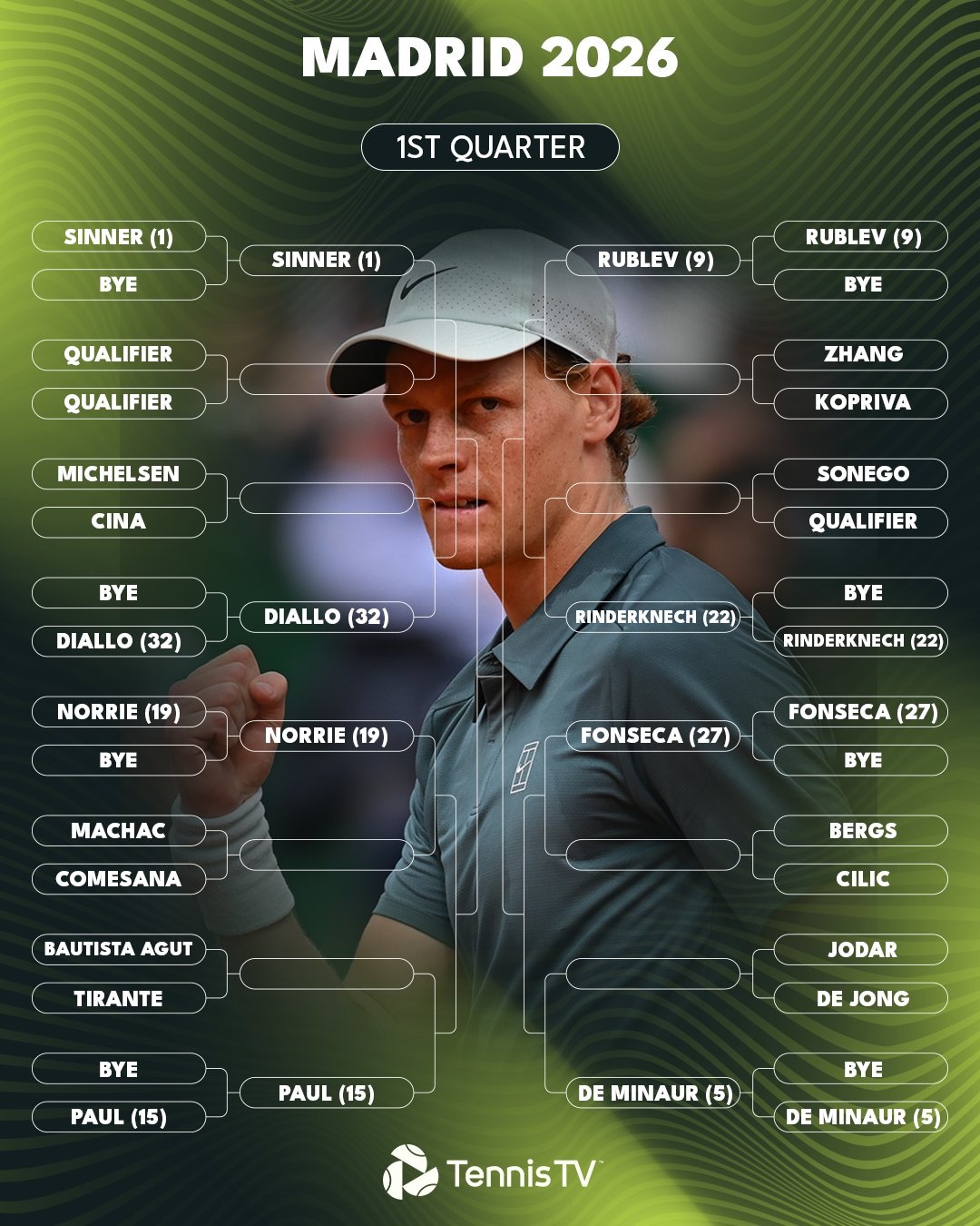 Nel primo quarto guidato da Jannik Sinner coabiteranno due interpreti che bene hanno fatto nelle loro prime e ultime uscite su terra battuta: Joao Fonseca, brasiliano n.27 del seeding reduce da due quarti di finale a Monte-Carlo e Monaco, e Andrey Rublev, recente finalista a Barcellona battuto all'ultimo atto dal francese Arthur Fils. La Spagna avrà di che crogiolarsi vista la presenza nello stesso quarto del veterano Roberto Bautista Agut, alla sua ultima stagione sul circuito, e il giovane Rafael Jodar, vincitore a Marrakech del suo primo titolo in carriera ad appena diciannove anni cui tutti pronosticano un grande avvenire: il primo esordirà contro l'argentino Tirante, mentre per Jodar al debutto ci sarà l'olandese De Jong. A regalar ancora più incertezza al quarto contribuirà la presenza di Marin Cilic, che però a Madrid non si mai spinto oltre i quarti di finale, del blega Zizou Bergs, sempre eliminato al primo turno nelle sue due partecipazioni al torneo, eliminato l'anno scorso agli ottavi in quello che resta a oggi il suo miglior piazzamento nell'evento.