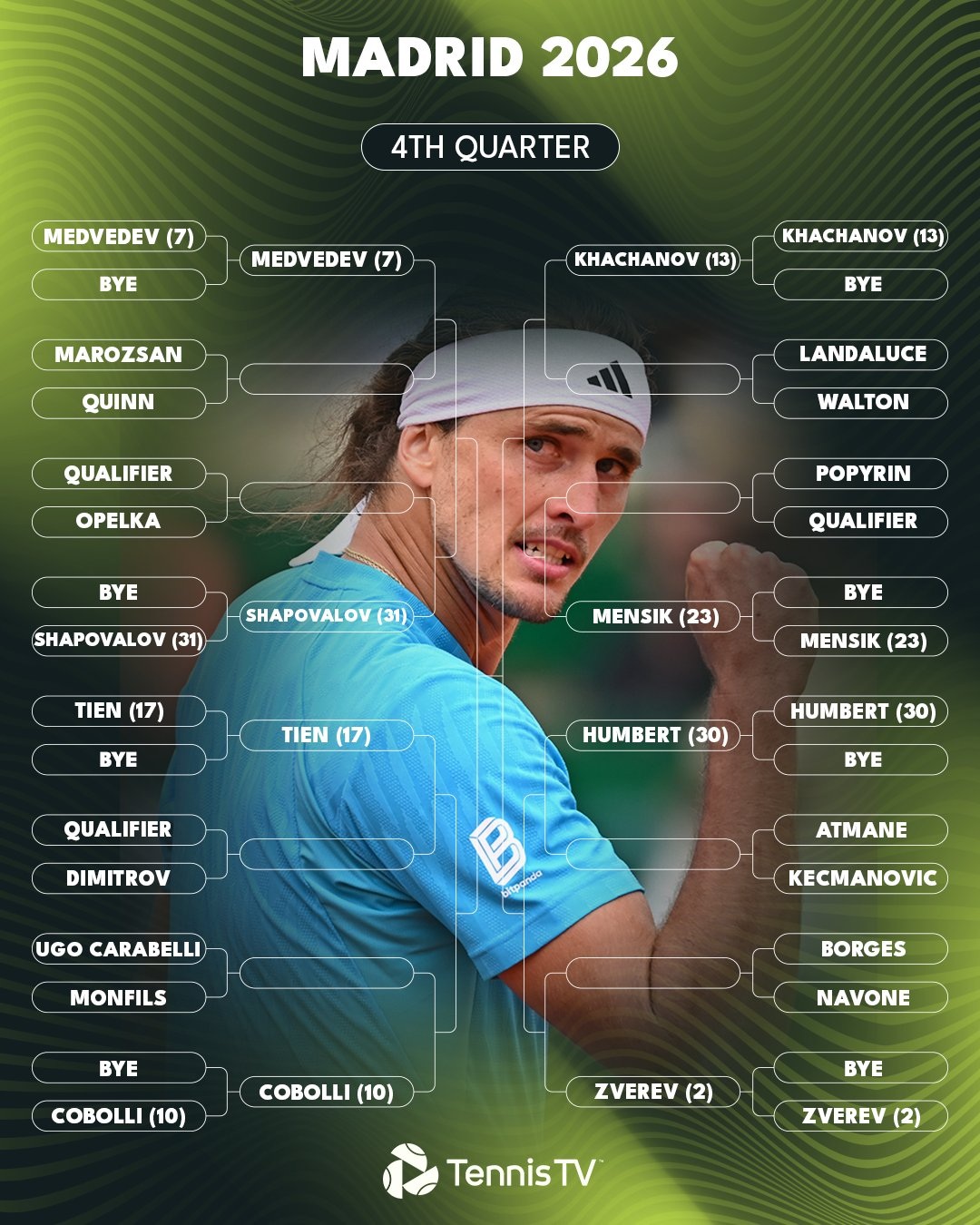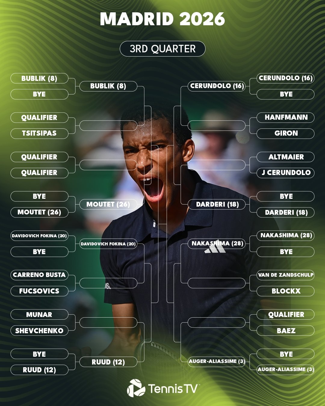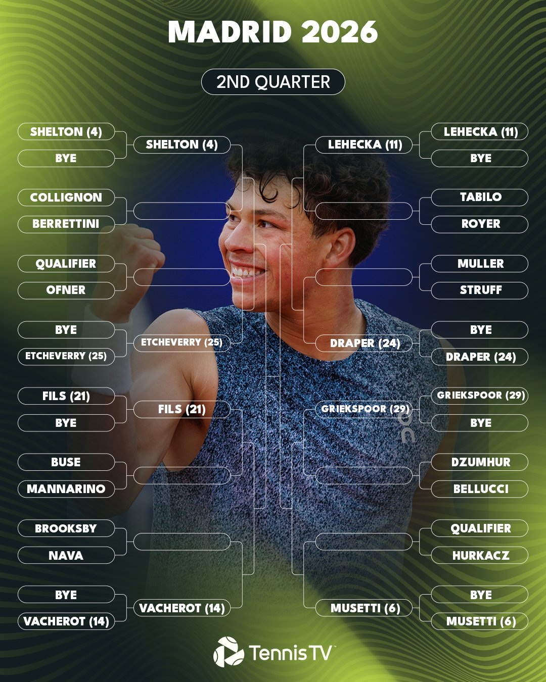 Lungo la strada che potrebbe portarlo al quarto contro Lorenzo Musetti, il campione di Monaco, Ben Shelton, potrebbe affrontare al secondo turno l'azzurro Matteo Berrettini e subito dopo il vincitore di Barcellona, il francese Arthur Fils. Con il ritiro del britannico Draper annunciato a sorteggio effettuato, l'incertezza aumenta ed ecco quindi profili quali il monegasco Vacherot e il ceco Jiri Leheck (n.11) guadagnar credito per una corsa che potrebbe vederli arrivare fino agli ultimi atti del torneo. Ma attenzione anche a Tallon Griekspoor, atterrato in un quarto dai valori assai livellati, l'olandese si è dimostrato giocatore capace - quando in giornata - di saper arrivare fino in fondo e di sfatare ostici tabù come quello che Madrid offre ora lui.