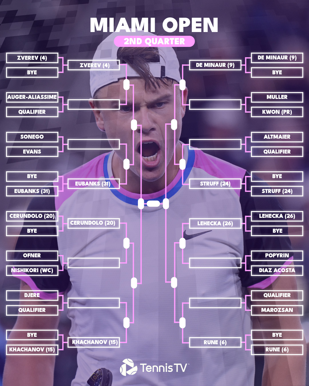 Nell'altro ottavo le teste di serie più alte sono Holger Rune (6) e Alex De Minaur (9). Il danese ha vinto 13 delle 19 partite giocate finora in stagione nel circuito ATP e si presenta in Florida sulla scia del quarto di finale a Indian Wells. Finalista a Brisbane a inizio stagione, Rune sfiderà all'esordio l'ungherese Fabian Marozsan o un qualificato; e al terzo turno potrebbe incrociare Jiri Lehecka, fermato da Sinner a Indian Wells.