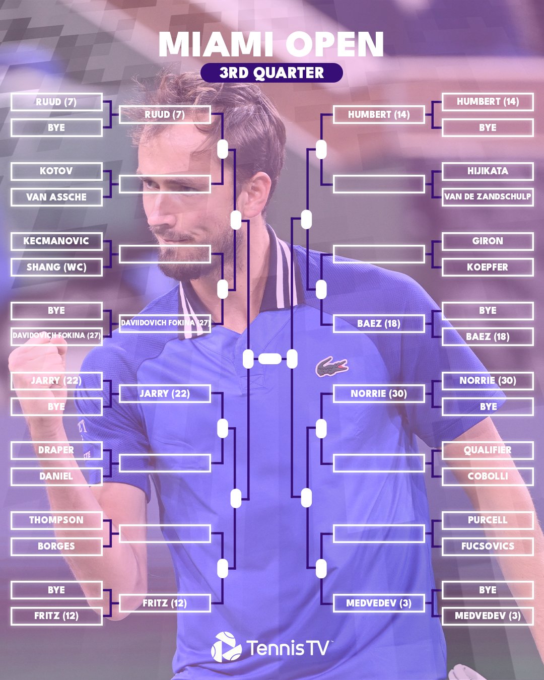 Il campione in carica Daniil Medvedev, battuto in finale a Indian Wells per il secondo anno consecutivo, punta a vincere per la prima volta in carriera due titoli in uno stesso torneo. Venti volte campione ATP, il moscovita ha vinto 14 delle 17 partite giocate quest'anno nel circuito maggiore. Il suo percorso a Miami partirà contro Max Purcell o Marton Fucsovics. Al terzo turno potrebbe incontrare Cameron Norrie o Flavio Cobolli. Nel suo ottavo di finale trova due dei giocatori più in forma delle ultime settimane, Ugo Humbert e Sebastian Baez.