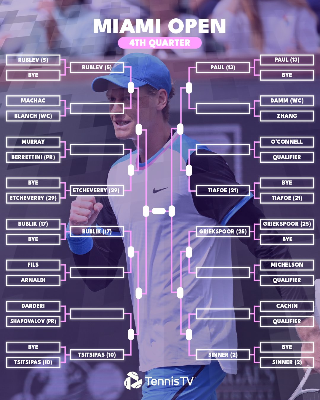 L'ultimo quarto è la sezione di Jannik Sinner, sconfitto per la prima volta nel 2024 nella semifinale del Masters 1000 di Indian Wells. Finalista a Miami l'anno scorso, l'azzurro ha ora 495 punti da recuperare in classifica nei confronti di Carlos Alcaraz, sconfitto proprio dall'altoatesino in semifinale dodici mesi fa.