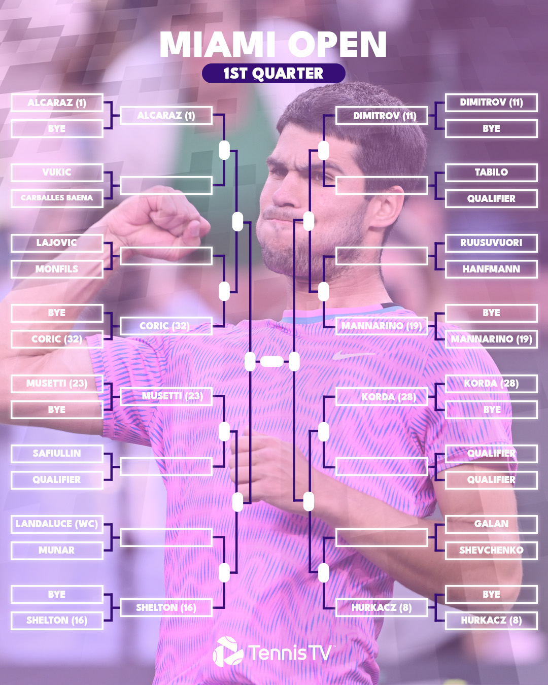 Secondo giocatore con almeno cinque Masters all'attivo prima di compiere 21 anni dopo rafa Nadal, Alcaraz ha già trionfato a Miami nel 2022. Il suo percorso in Florida inizia contro Aleksandar Vukic o Roberto Carballes Baena, direttamente al secondo turno come tutte le 32 teste di serie.