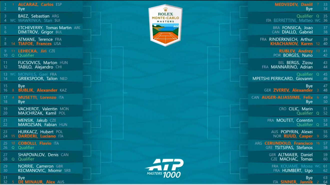Luciano Darderi, il giocatore con più partite vinte e più titoli all'attivo sulla terra battuta nelle ultime 52 settimane, giocherà per la prima volta a Monte-Carlo. Esordirà contro il polacco Hubert Hurkacz: chi vince giocherà al secondo turno contro il ceco Jakub Mensik o l'ungherese Fabian Marozsan.