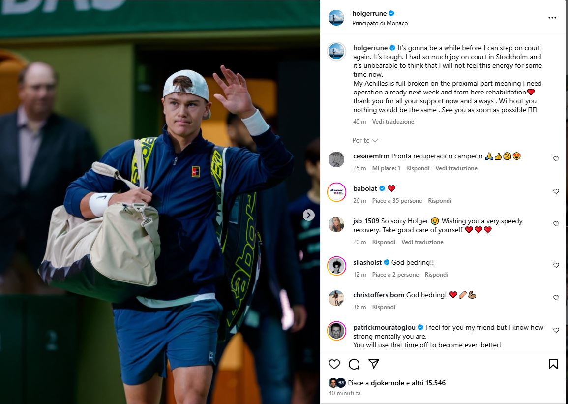 Holger Rune ha confermato la diagnosi e la lunga assenza in un messaggio pubblicato attraverso i suoi canali social. "Ci vorrà un po' prima di poter tornare in campo - ha scritto - Il mio tendine d'Achille si è rotto nella sua parte prossimale e questo significa che dovrò operarmi la prossima settimana e poi inizierà la riabilitazione. Ci vediamo il più presto possibile" ha scritto.