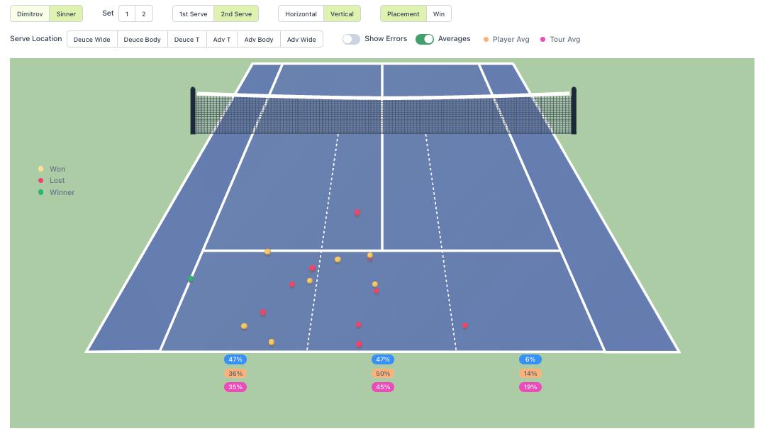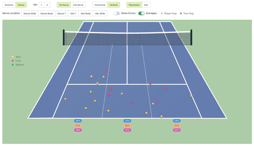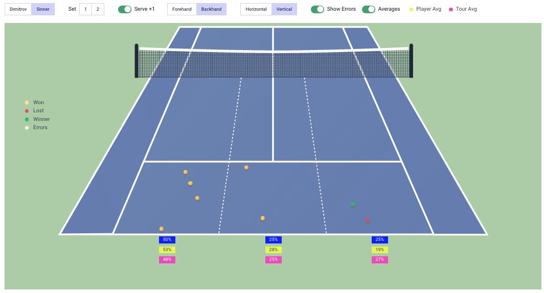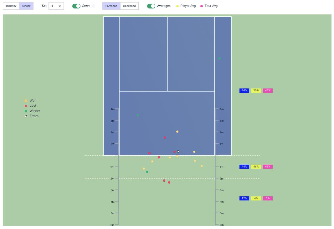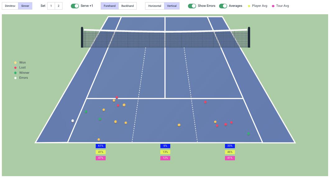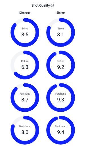 La qualità dei suoi colpi, secondo l'algoritmo di TennisViz che analizza ogni colpo ed elabora i dati raccolti da Tennis Data Innovations, è stata valutata in 9,63 su una scala da 0 a 10. Praticamente ai limiti della perfezione. Per quanto riguarda i singoli aspetti del gioco, Dimitrov gli è stato superiore come qualità media solo al servizio, 8,5 contro 8,1. Sinner però ha dominato in risposta (9,2 contro 6,3), e con i due fondamentali a rimbalzo. Di rovescio (9,4) ha giocato ancora meglio che di diritto (9,3), sempre secondo l'algoritmo TennisViz, e soprattutto è proprio sulla diagonale sinistra, contro il rovescio a una mano di Dimitrov, che ha ottenuto il più significativo vantaggio competitivo.