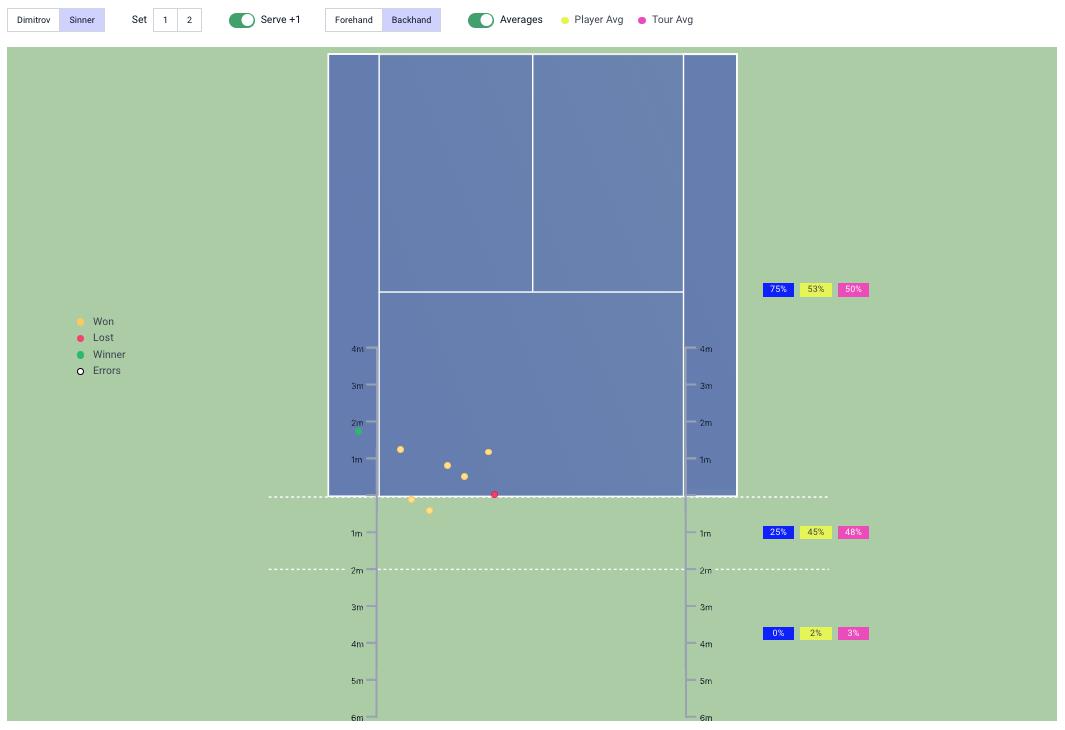E ha perso solo un punto quando ha impostato lo scambio con la combinazione servizio-rovescio. Peraltro, rispetto alle sue medie nelle ultime 52 settimane, la distribuzione dei rovesci giocati come primo colpo dopo il servizio mostrano un Sinner leggermente più incline ad aprirsi il campo sulla diagonale sinistra puntando più sulla profondità che sugli angoli stretti.