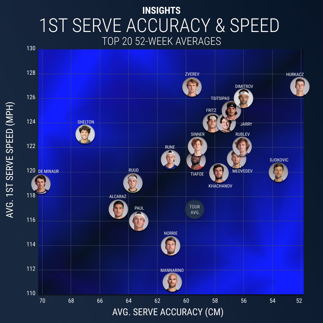 L'evoluzione di Sinner non è iniziata certo quest'anno. I dati dei Leaderboard ATP parlano chiaro. Nelle ultime 52 settimane l'altoatesino è secondo per game di servizio vinti (88.8%) dietro Hurkacz con cui si è allenato a Indian Wells. Eppure Hurkacz, rivela la grafica Tennis Data innovations e TennisViz su dati ATP pubblicata sul profilo X Tennis Insights, serve la prima a una velocità media più elevata e, tolti i servizi al corpo, più vicino alle righe.