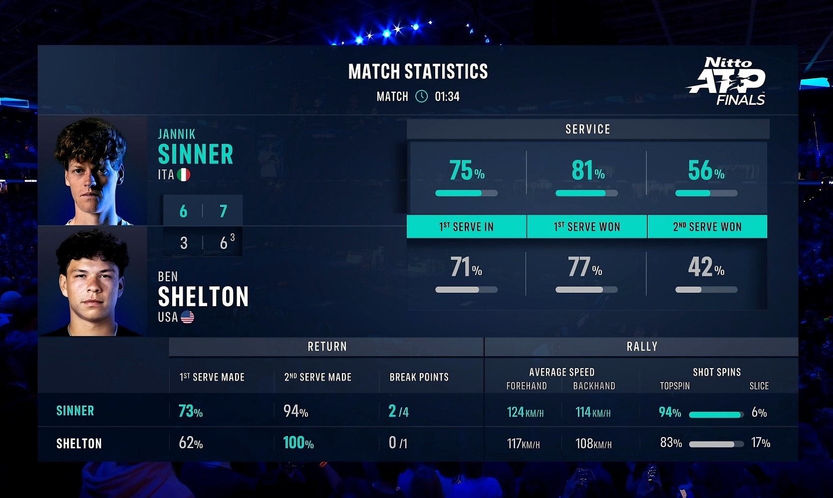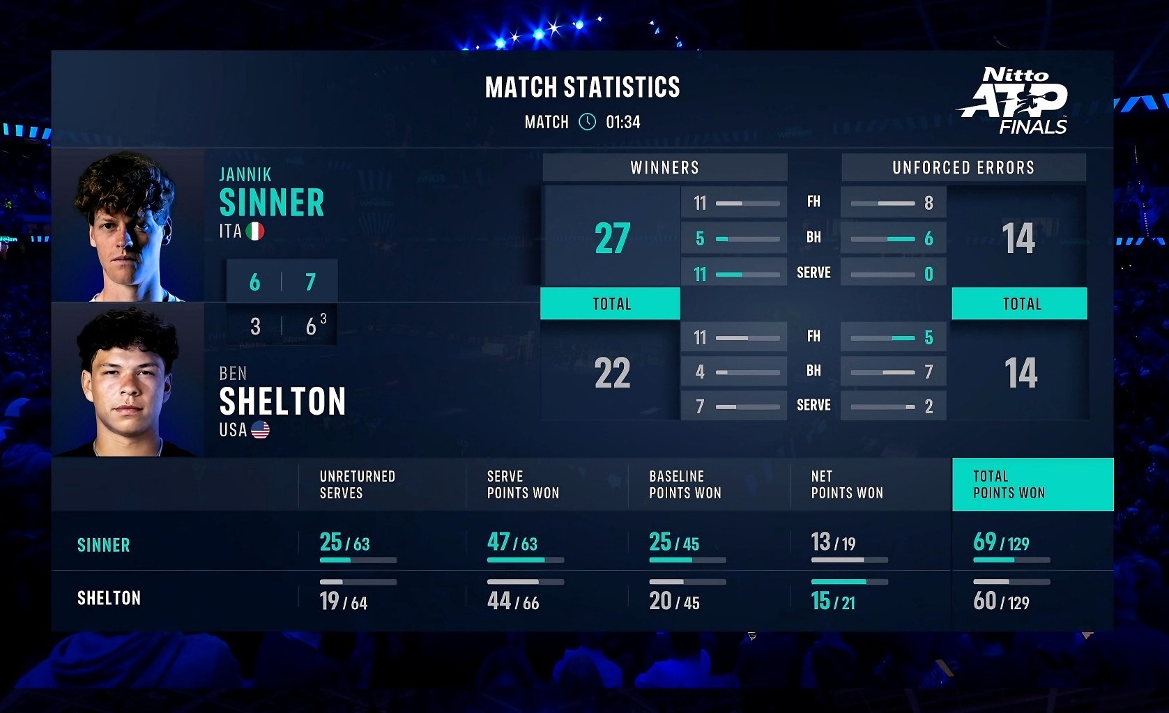 Sinner fends off Shelton to extend his indoor winning run!#NittoATPFinals pic.twitter.com/0UziXc0hic
