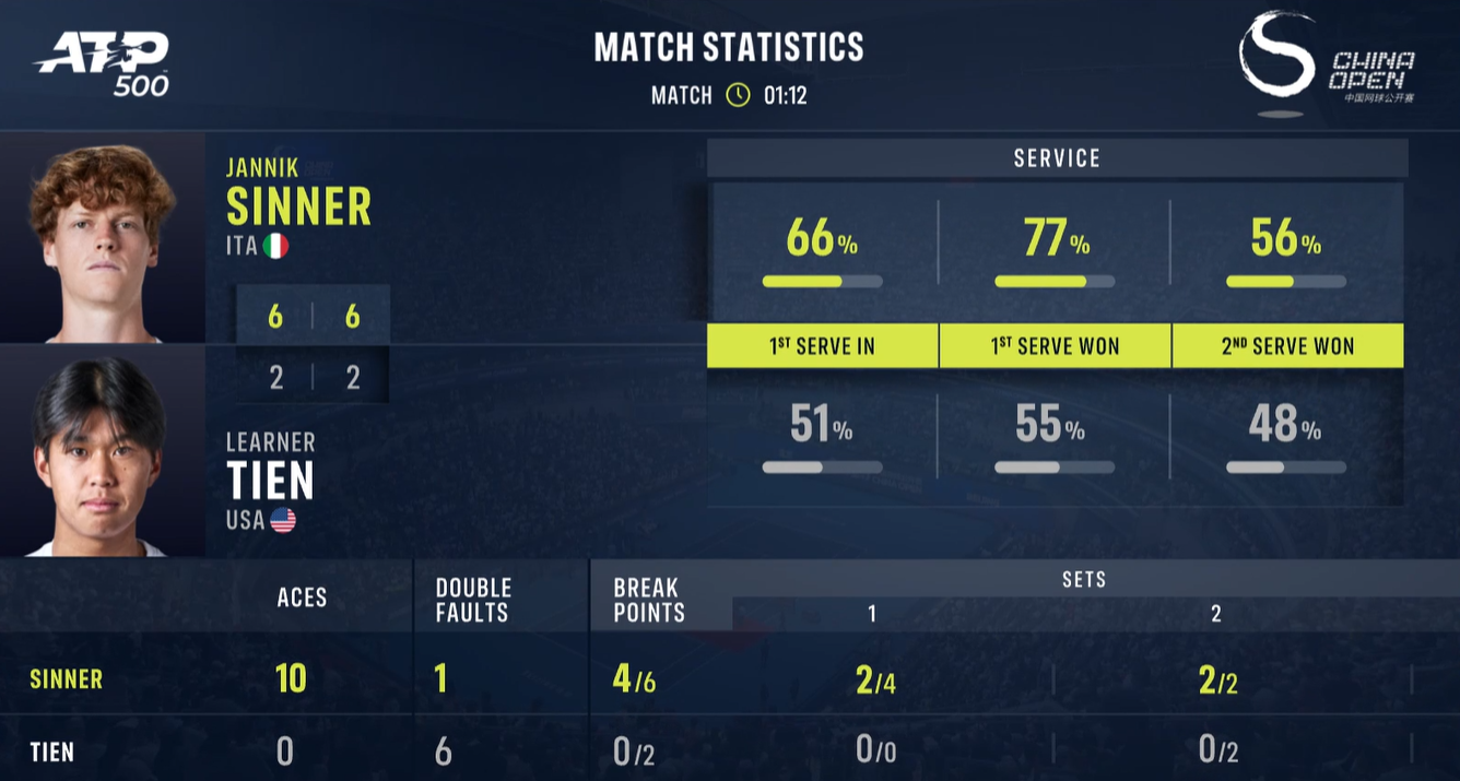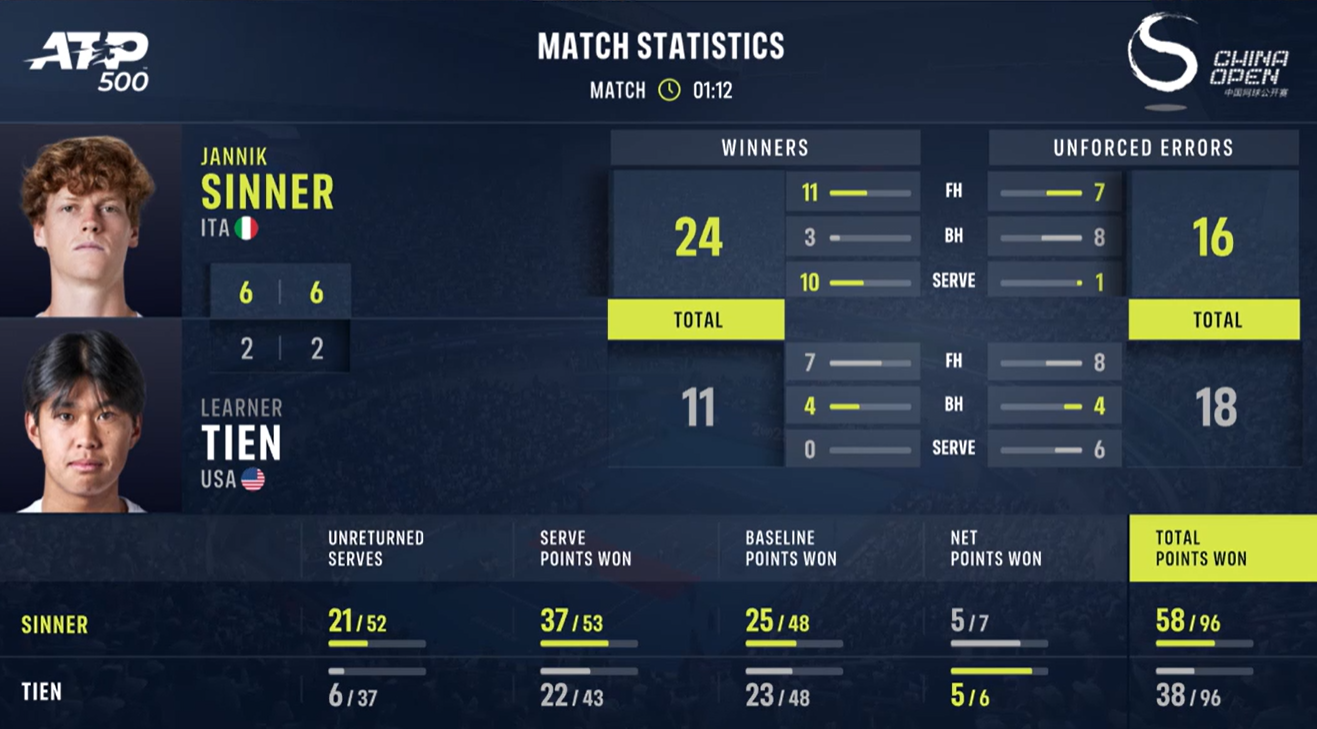 Dopo 34 minuti, il primo set si chiude col quinto ace per Sinner. Numeri convincenti per lui al servizio, col 60% di prime in campo e un rendimento del 73%. Solo tre punti persi anche sulla seconda (7/10). In totale, l'altoatesino vanta 11 vincenti e 10 gratuiti. Tien, dal canto suo, si ferma al 41% di prime in campo, e agli 11 non forzati abbina "solo" cinque vincenti