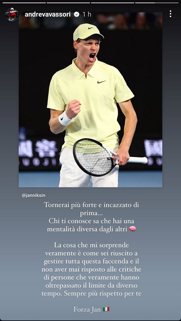 Andrea Vavassori si schiera apertamente dalla parte di Jannik Sinner. "Tornerai più forte e inc***ato" di prima, ha scritto in una storia Instagram.