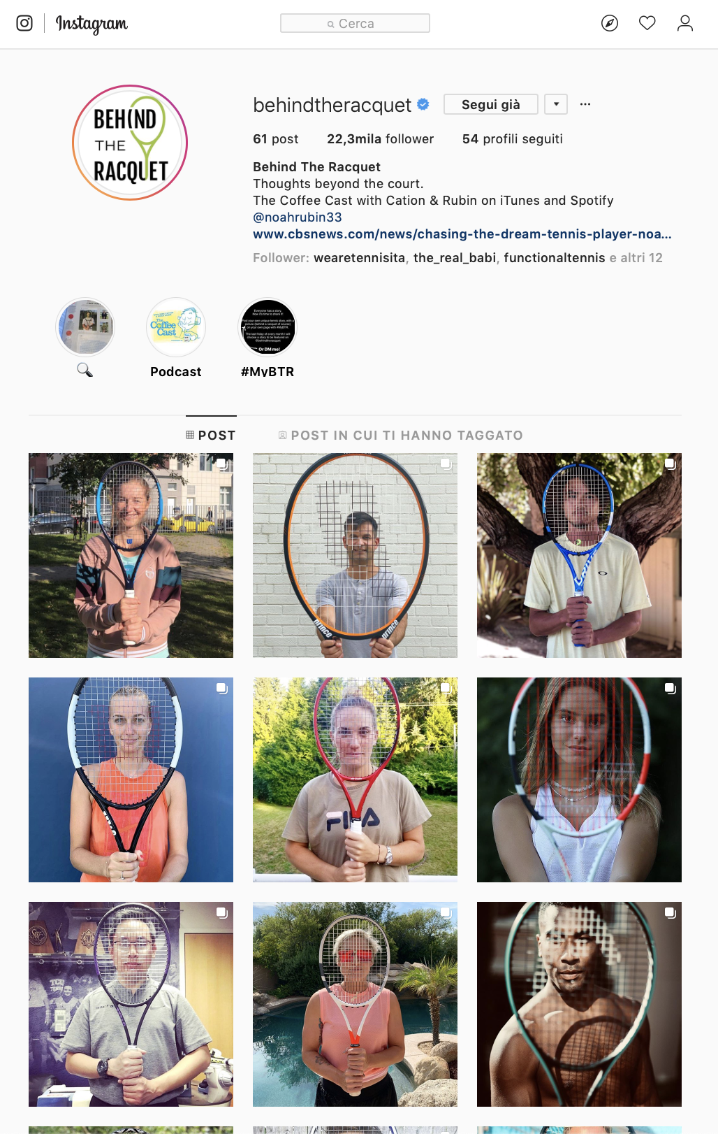 Per chi è curioso di conoscere i tennisti oltre il puro fatto sportivo, consigliamo di scoprire e seguire la pagina Instagram “Behind The Racquet”, un progetto ideato dall'americano Noah Rubin (n. 195 ATP) che mette in primo piano la persona celata dietro l'atleta. Molti giocatori e giocatrici hanno seguito l'esempio di Rubin, fotografandosi dietro le corde del proprio attrezzo e postando la foto sulla pagina del social network, insieme al racconto spontaneo delle difficoltà personali della vita nel mondo Pro. Da minuscola goccia nel mare del tennis, l'iniziativa è diventata “un caso”, spinta dall'urgenza di parlare, aprirsi al mondo per scacciare i propri incubi e aiutare altri colleghi a farlo.