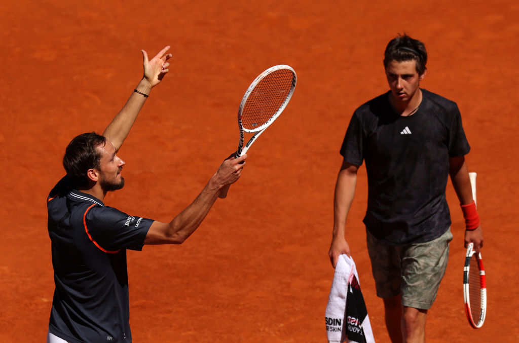 Daniil Medvede aizza il pubblico di Madrid dopo aver perso il primo set contro Alexander Shevchenko (foto Getty Images)