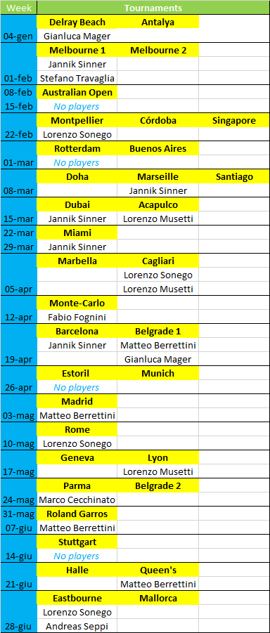 Jannik Sinner e Stefano Travaglia si sono giocati la finale dell’ATP 250 di Melbourne, poi Lorenzo Sonego è arrivato nei quarti a Montpellier, Sinner a Marsiglia e, la settimana dopo ancora Sinner a Dubai e Musetti in semifinale ad Acapulco.