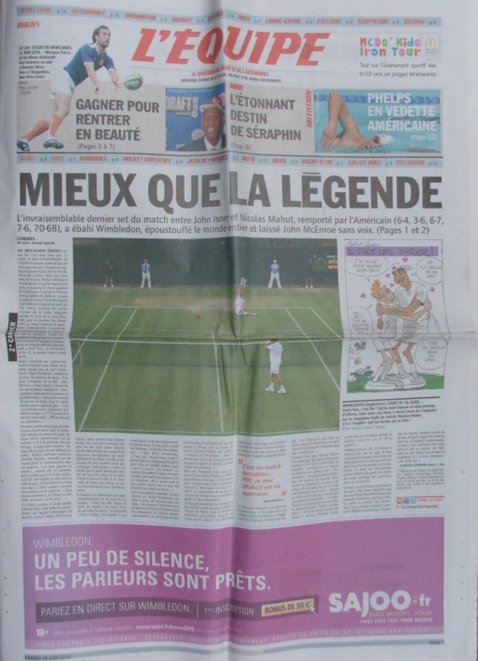 "Quante volte ho ritagliato le interviste di Pete Sampras, il mio idolo, o gli articoli sulla squadra francese di coppa Davis per poi attaccarli al muro della mia camerata a Poitiers e dormirci vicino così da motivarmi? Quante prime pagine ho fotografato per immortalare certi momenti magici? Chi non ha mai provato a divertirsi prevedendo la prima pagina del giorno dopo o anticipando i voti in pagella dei giocatori della propria squadra di calcio prima di verificarli ufficialmente? Quante carriere di atleti professionisti, coach, dirigenti e giornalisti ha creato il giornale?"