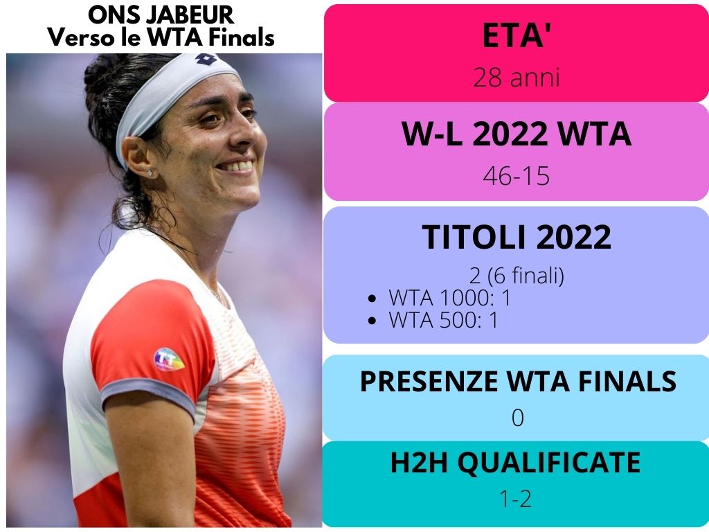 Ons Jabeur disputa per la prima volta le WTA Finals, che ha già sfiorato l'anno scorso. Dodici mesi fa, però, non ha voluto viaggiare a Guadalajara, sede del torneo, come prima riserva. “Per me sono come un piccolo Slam” ha dichiarato dopo la finale dello US Open.
