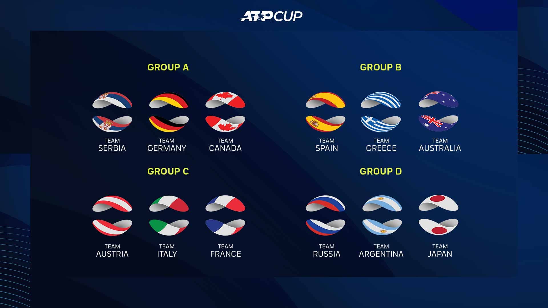 Completato il sorteggio per l'ATP Cup 2021, seconda edizione della gara a squadre (7,5 milioni di dollari di montepremi), in programma dall’1 al 5 febbraio Melbourne Park, in contemporanea con due ATP 250 nell'ambito della "bolla" pre Australian Open. Ci saranno dodici nazioni al via, e 14 dei primi 15 giocatori nel ranking ATP.